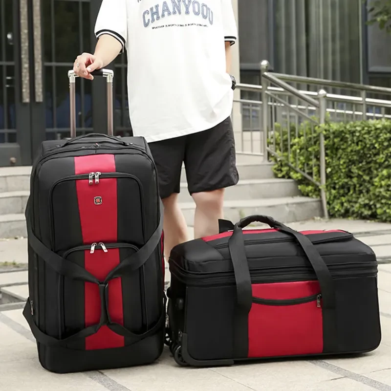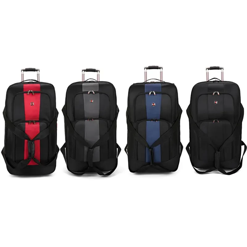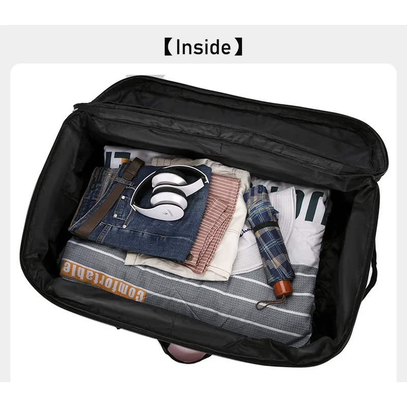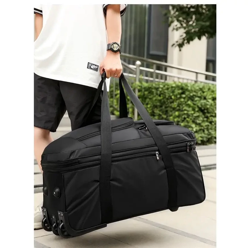 Tágas, xxl méretű utazótáska. Nagyon tartós, vízálló poliészter anyagból készült. Behúzható fogantyúval és további zsebekkel a jobb rendszerezés érdekében. Három erős kerék van az alján. Bővíthető változat plusz 10 cm el növelhető a táska mérete.