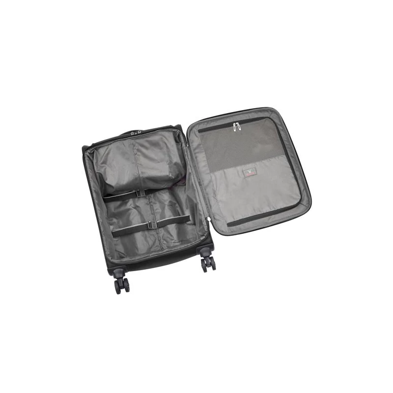 Rögzített TSA számzárral felszerelt, belsejében leszorító pánt, valamint cipzáras zseb áll a rendelkezésünkre. A kabinbőrönd elülső felén további cipzáras extra zsebek segítik a pakolást.