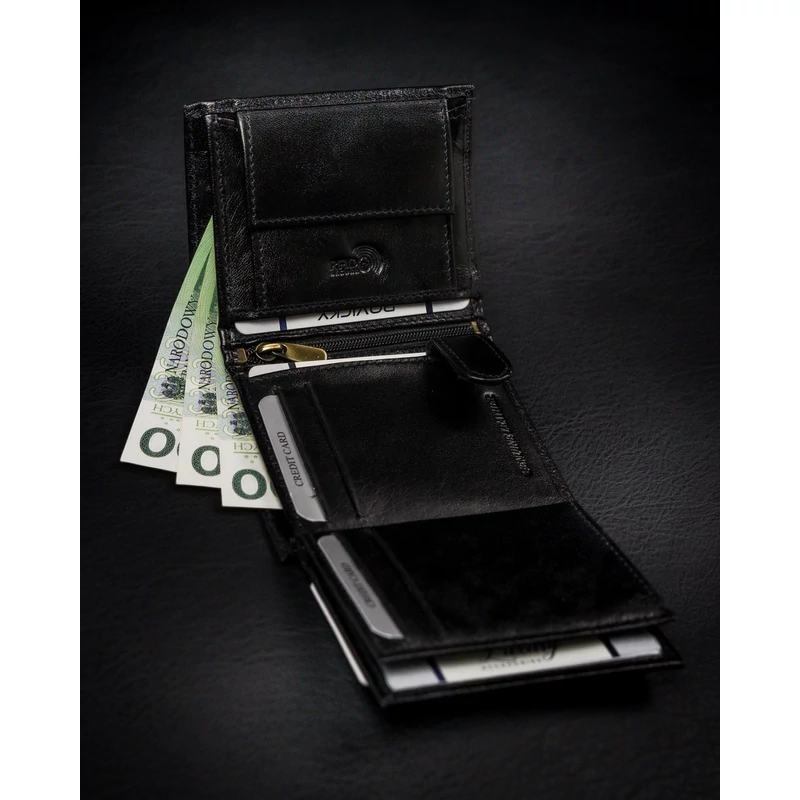 - 2 széles, nyitott zseb bankjegyek számára. Ez a számú zseb lehetővé teszi, hogy nagy mennyiségű papírpénzt helyezzen el pénztárcájában. Ez a számú rekesz lehetővé teszi a pénz pénznemek szerinti csoportosítását is, ha a lengyel zlotynál többet használ.
