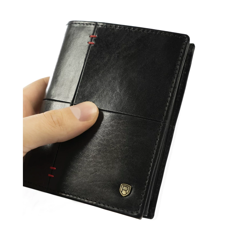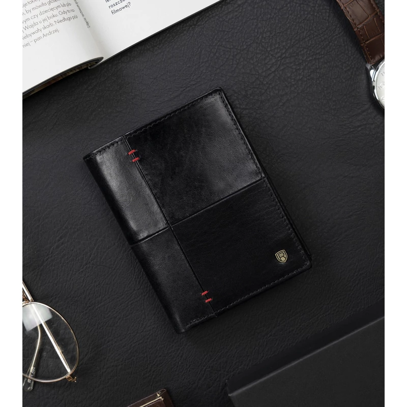 Függőleges férfi pénztárca piros varrással, természetes szemcsés bőr - Rovicky