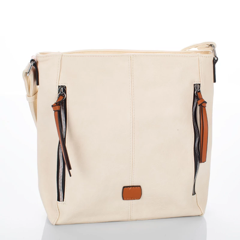 A táska egy nagy részből áll melynek belseje osztott elrendezésű. Található a belsejében 2db kisebb mobiltartó illetve 2db cipzáras zseb. A táska mindkét oldalán található 1-1db cipzáras zseb illetve a hátoldalán is kialakítottunk 1db cipzáras zsebet.