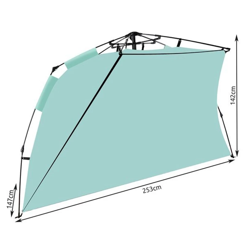 LEÍRÁS - poliészter bevonat, UV-álló, vízálló, üvegszálas keret, 3 hálós ablak, 5 belső és külső zseb, homokzsák, cipzáras ajtó, gyors összeszerelés, méretek: 147/253 / 142cm, méretek összecsukás után: 15 / 15 / 84cm , súlya: 2,80 kg, súlya a csomagban: 3,4 kg,