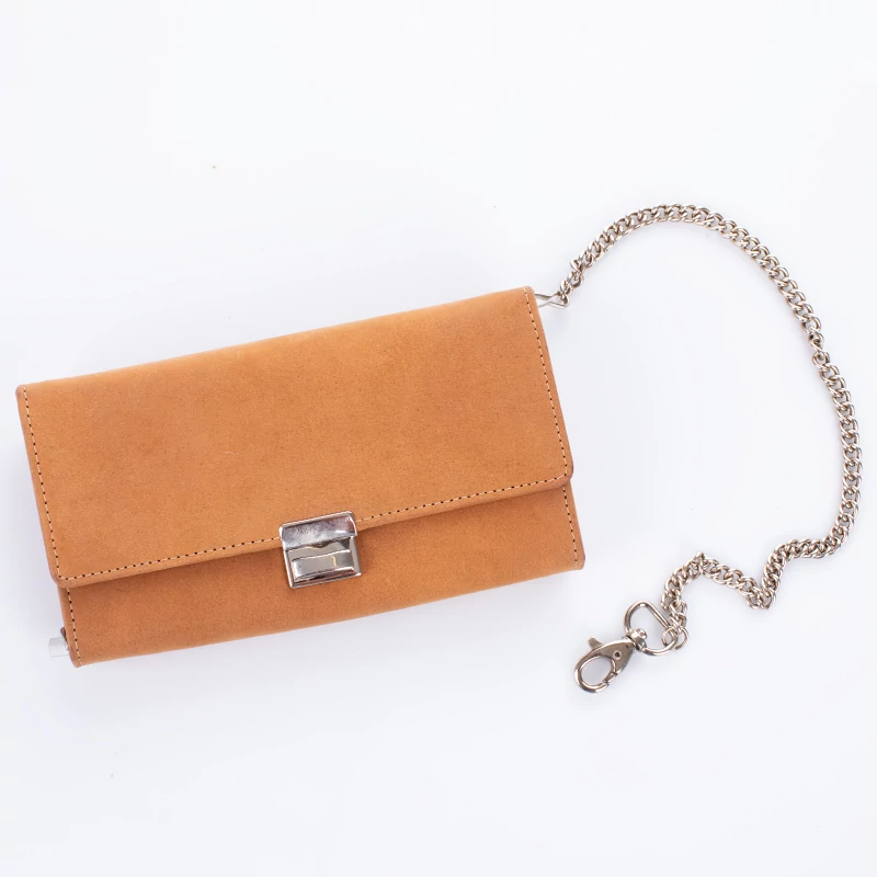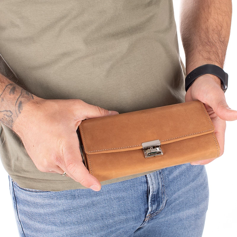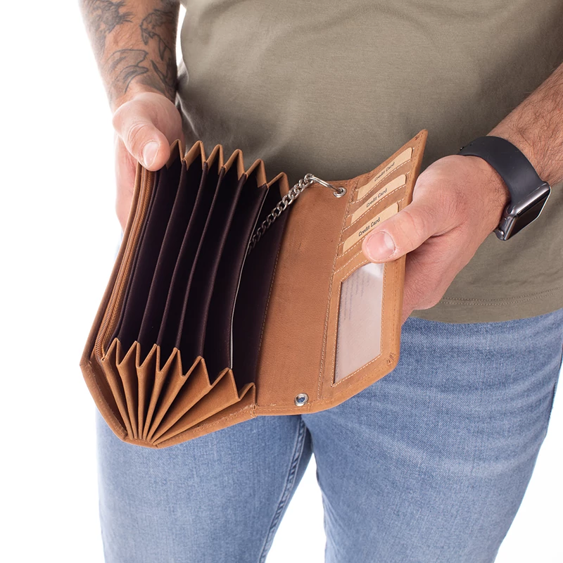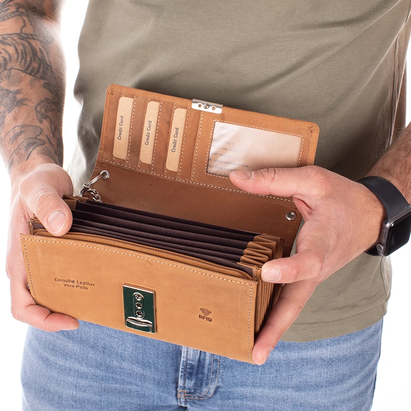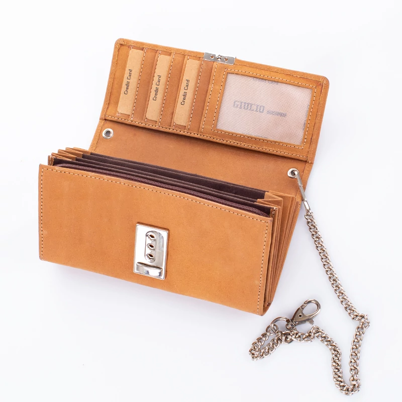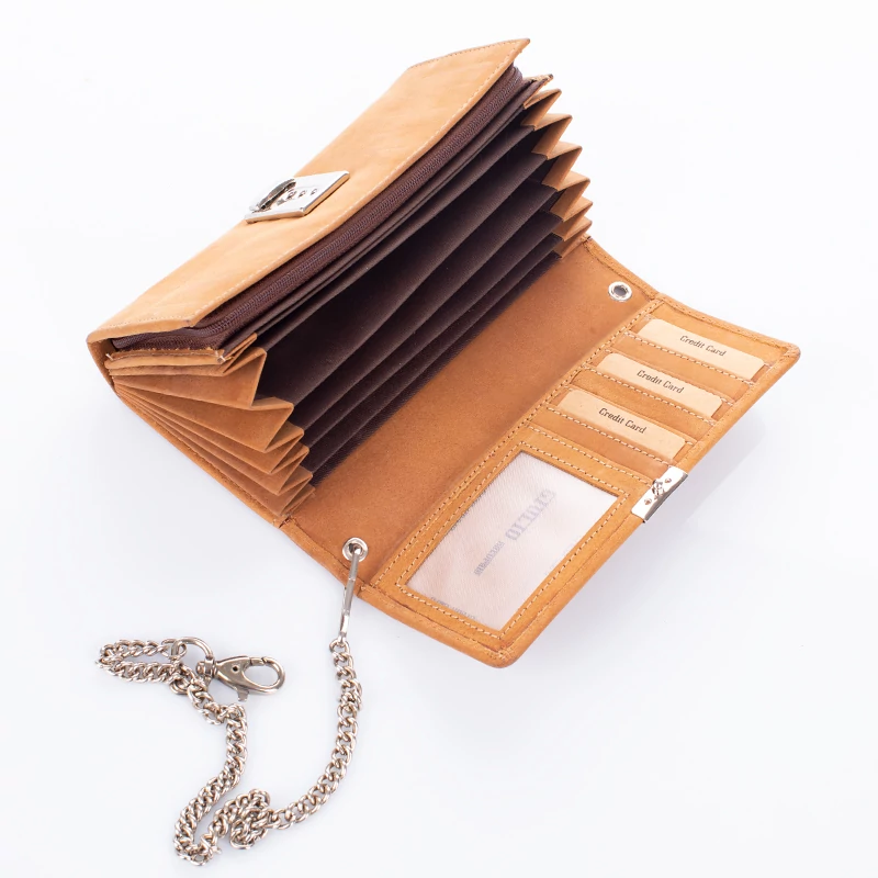 Elején háromfokozatú fém zárral záródik. Hét darab papírpénztartóval,  egy darab tágas, jól átlátható és egy darab kisebb cipzáras aprópénztartóval. A pénztárca hátulján található egy nyitott irattartó rekesz is.