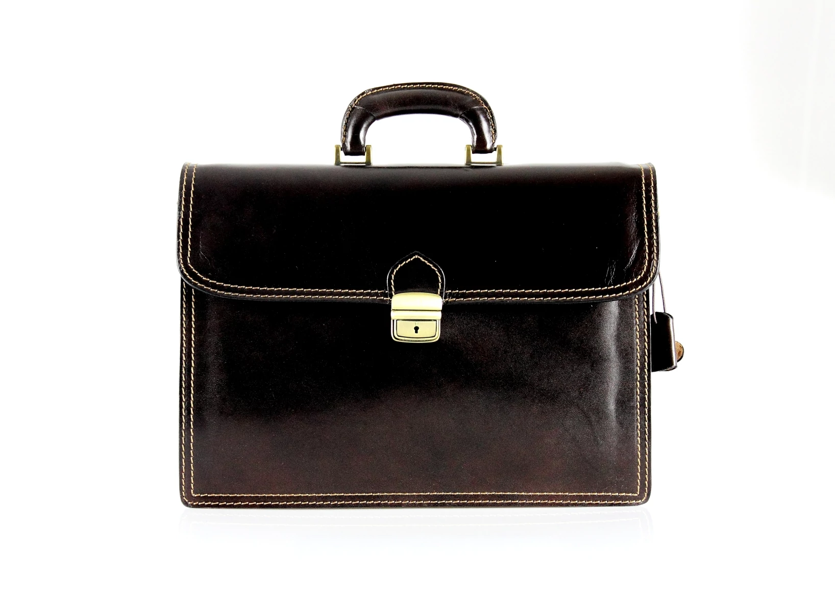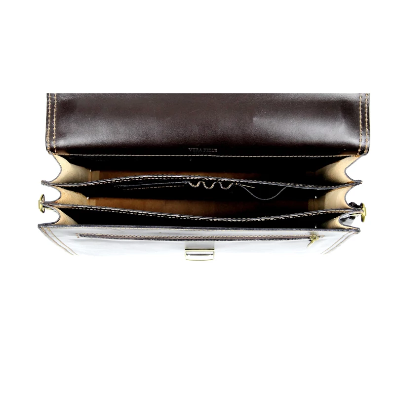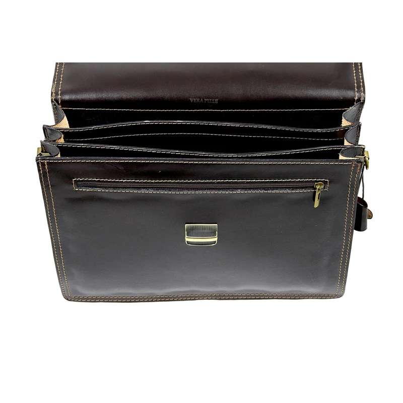Sötétbarna színű bézs cérnával tűzött, puha tapintású, merev tartású 3 részes férfi aktatáska.