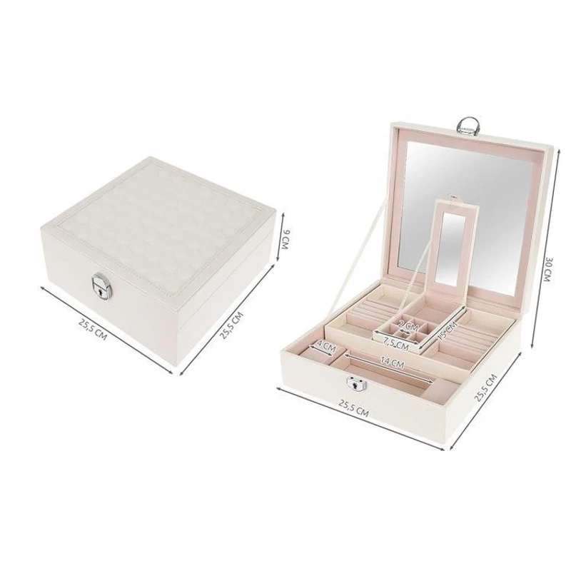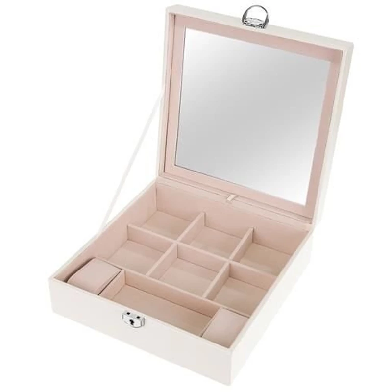 TARTÓS  - az ékszerdoboz a következőkből áll: egy levehető fedél 2 rekesszel, görgőkkel a gyűrűk számára, 4 rekesz egyéb ékszerek számára, egy kivehető kazetta. Alatta 6 további rekesz, 2 betét karóráknak vagy karkötőknek és 1 nagy, téglalap alakú rekesz nagyobb tárgyaknak. A rekeszek puha anyaggal vannak bélelve, hogy megóvják a finom ékszereket a karcolásoktól.