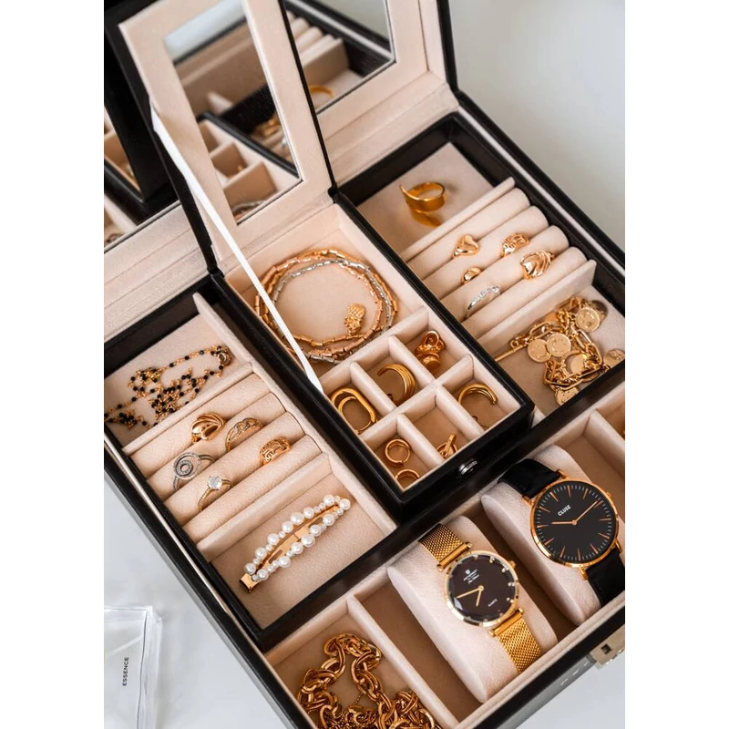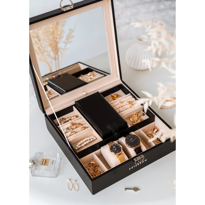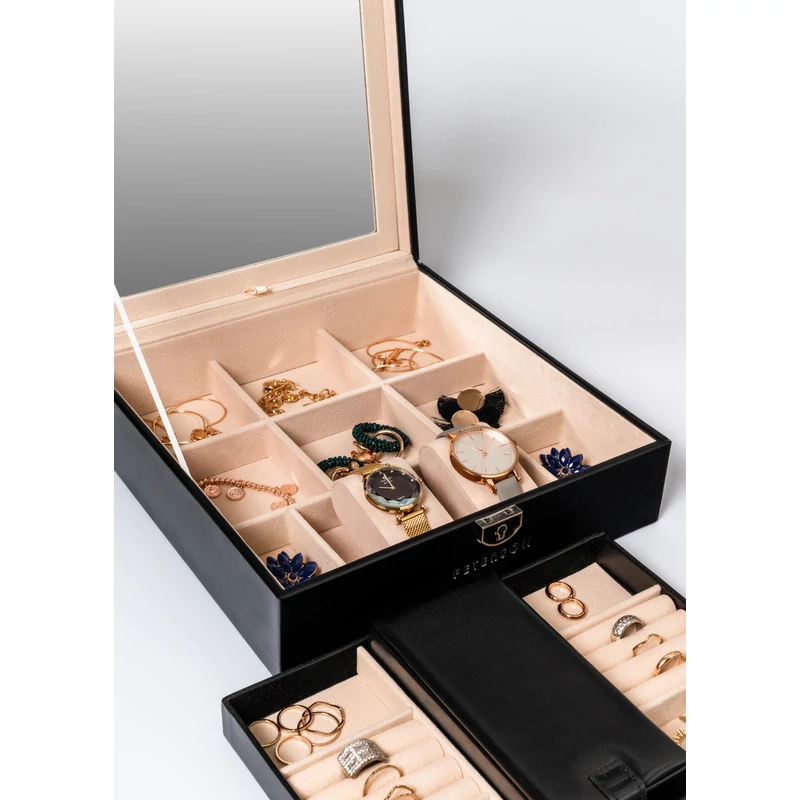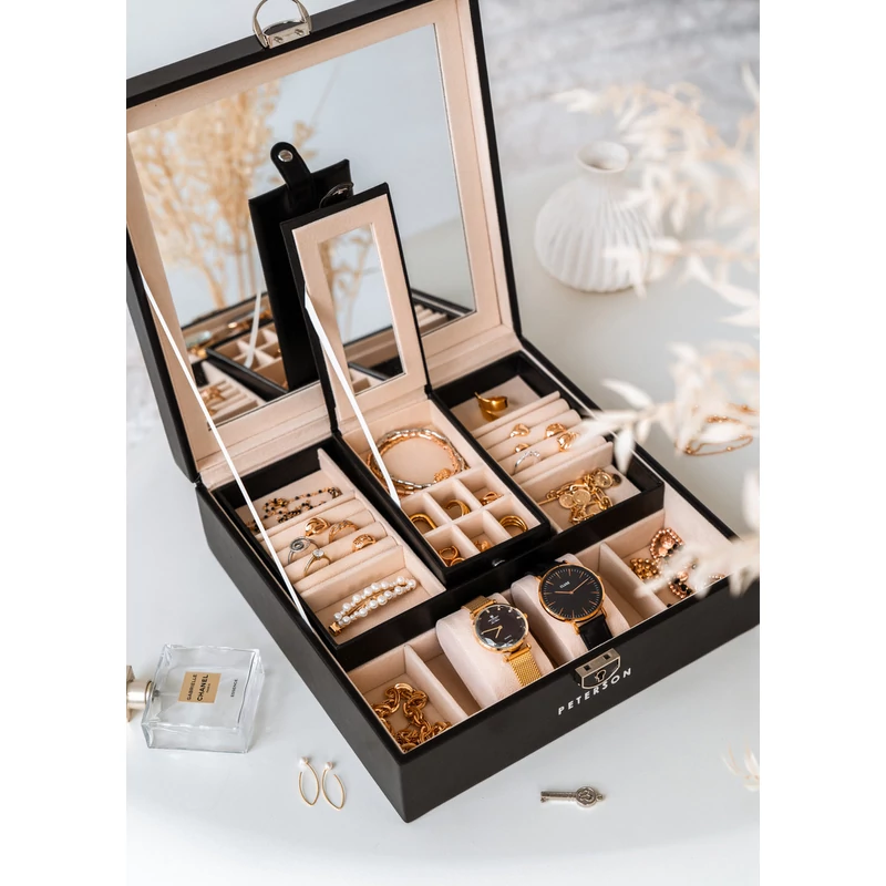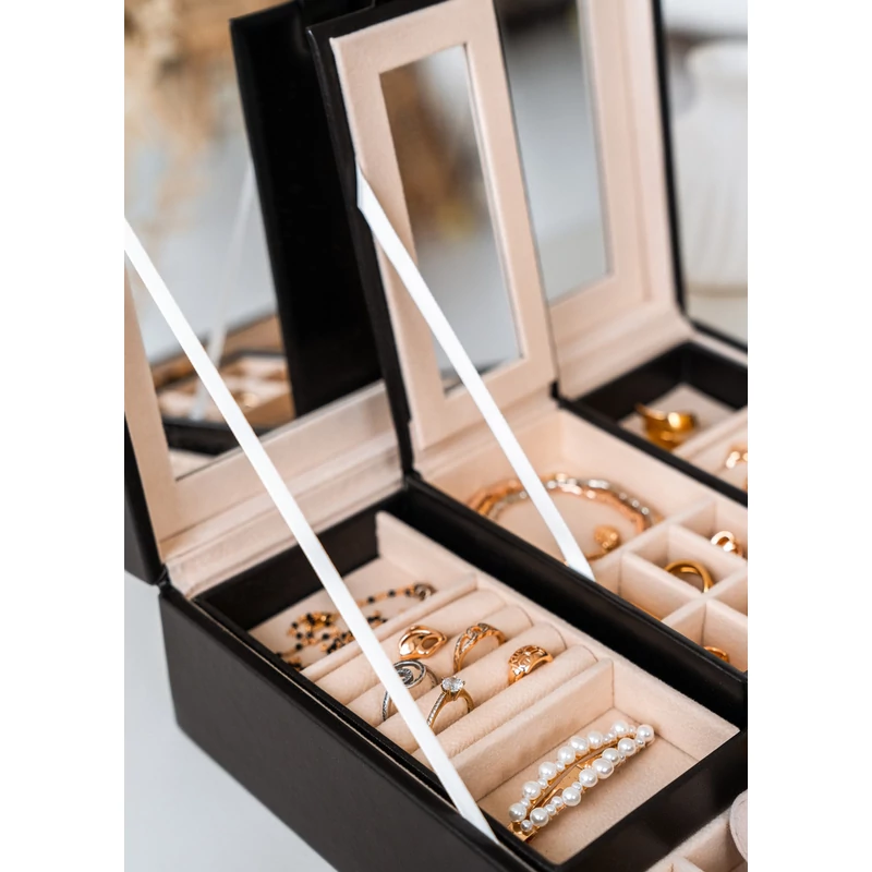 Belül van egy kis tok, amit bármikor kivehetsz! Ez egy praktikus módja annak, hogy utazás közben magával vigye kedvenc ékszereit. A tok kis tükörrel és rekeszekkel van felszerelve az ékszerek válogatásához.