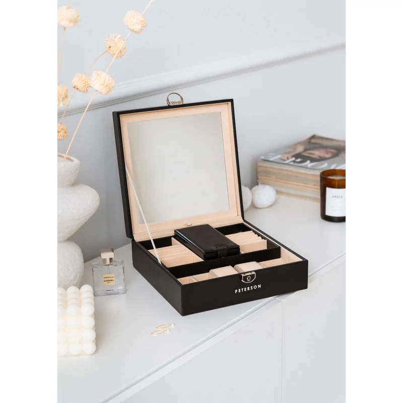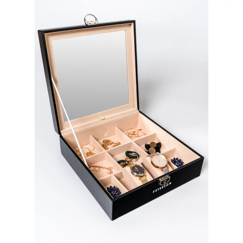 A doboz 20x20 cm-es tükörrel van felszerelve, amely megkönnyíti a sminkelést, az ékszerek fel- és levételét, valamint a megjelenés előtti ellenőrzést.