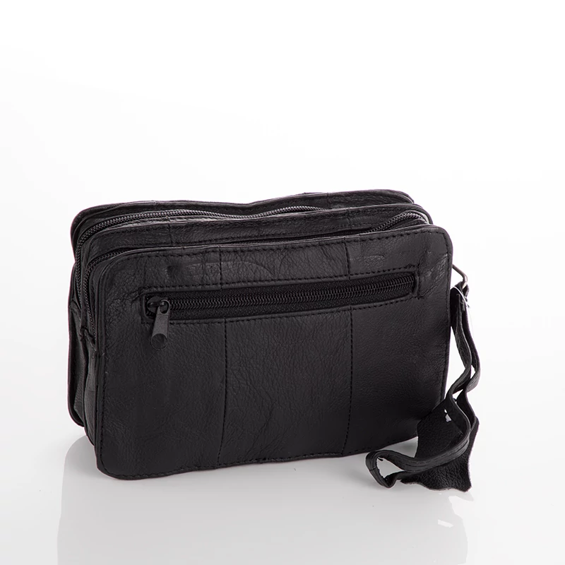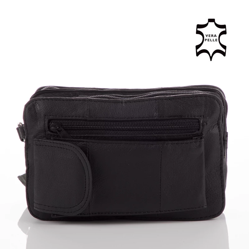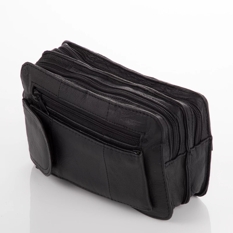 Ez a fekete színű autóstáska 5 zsebes, cipzáras és valódi bőrből készült.