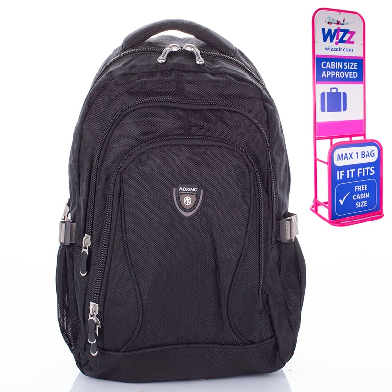 Vagány, akciós kézipoggyász méretű laptoptartós táska akciós áron, 10000 forint alatt. Modern, igényes stílusban.Erős vászon anyagból. Praktikus tárolórészekkel, sok zsebbel, sötétkék/fekete színben. Párnázott vállpánt és hátrész a kényelmes viseletért.  2 oldalán palacktartó zseb a külső részen. 4 cipzáros tárolórész. A második rekeszben különböző méretű belső zseb található, akár irattartó,telefon,íróeszköz,pénztárca,kulcsok tárolására alkalmas.  Kiránduláshoz, szabadidős tevékenységekhez, utazáshoz remek választás. A hátizsák speciális mérete lehetővé teszi, hogy ingyenesen felvigyük a WizzAir légijáratainak fedélzetére. Fedélzeti hátizsák, amely legtöbb fapados légitársaság fedélzetére felvihető.