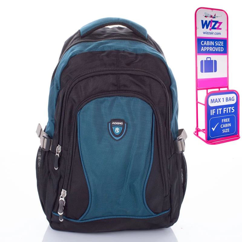 Vagány, akciós kézipoggyász méretű laptoptartós táska akciós áron, 10000 forint alatt. Modern, igényes stílusban.Erős vászon anyagból. Praktikus tárolórészekkel, sok zsebbel, sötétkék/fekete színben. Párnázott vállpánt és hátrész a kényelmes viseletért.  2 oldalán palacktartó zseb a külső részen. 4 cipzáros tárolórész. A második rekeszben különböző méretű belső zseb található, akár irattartó,telefon,íróeszköz,pénztárca,kulcsok tárolására alkalmas.  Kiránduláshoz, szabadidős tevékenységekhez, utazáshoz remek választás. A hátizsák speciális mérete lehetővé teszi, hogy ingyenesen felvigyük a WizzAir légijáratainak fedélzetére. Fedélzeti hátizsák, amely legtöbb fapados légitársaság fedélzetére felvihető.