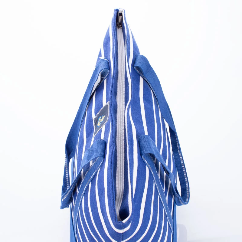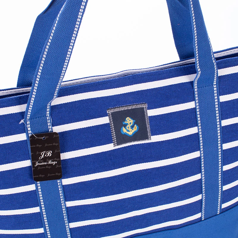 MARINE STYLE – a táska sötétkék színben kapható, fehér csíkokkal, alja juta anyagból készült. Tökéletesen elfér a strandon, de városi vagy sporttáskaként is használható.