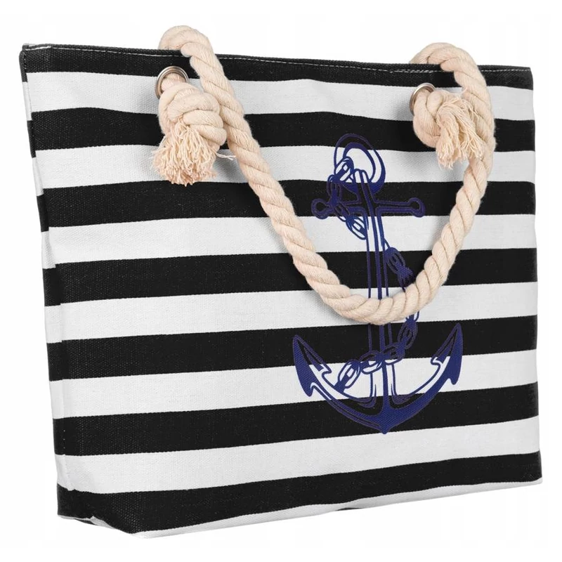 MARINE STYLE – a táska sötétkék színben kapható, fehér csíkokkal, alja juta anyagból készült. Tökéletesen elfér a strandon, de városi vagy sporttáskaként is használható.