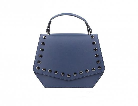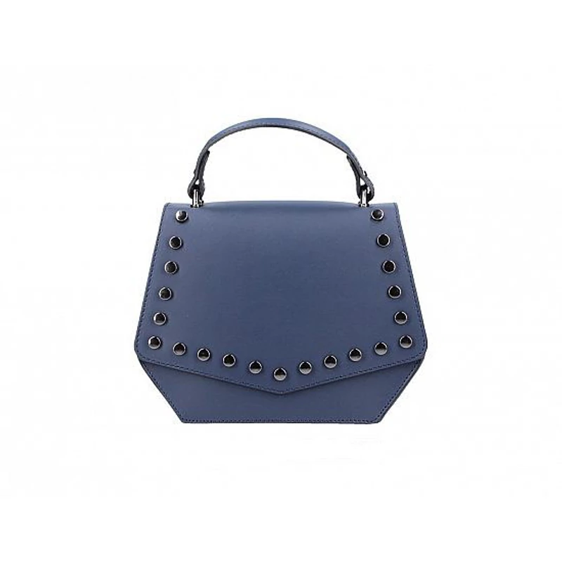 Valódi bőrből készült olasz női táska. Kisebb méretű, merev tartású, stílusosan, ízlésesen szegecselt. Belseje egyterű, egy oldalsó nyitott rekesszel. Kis kézi fogója bájossá varázsolja, ezen kívül ráakasztható hosszú pántja is van, melynek hossza állítható, maximális mérete 115 cm. A ráhajtója dupla mágnespatenttal záródik.