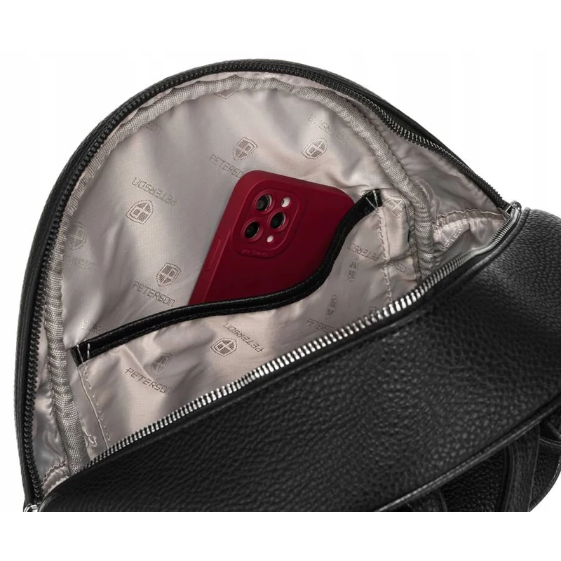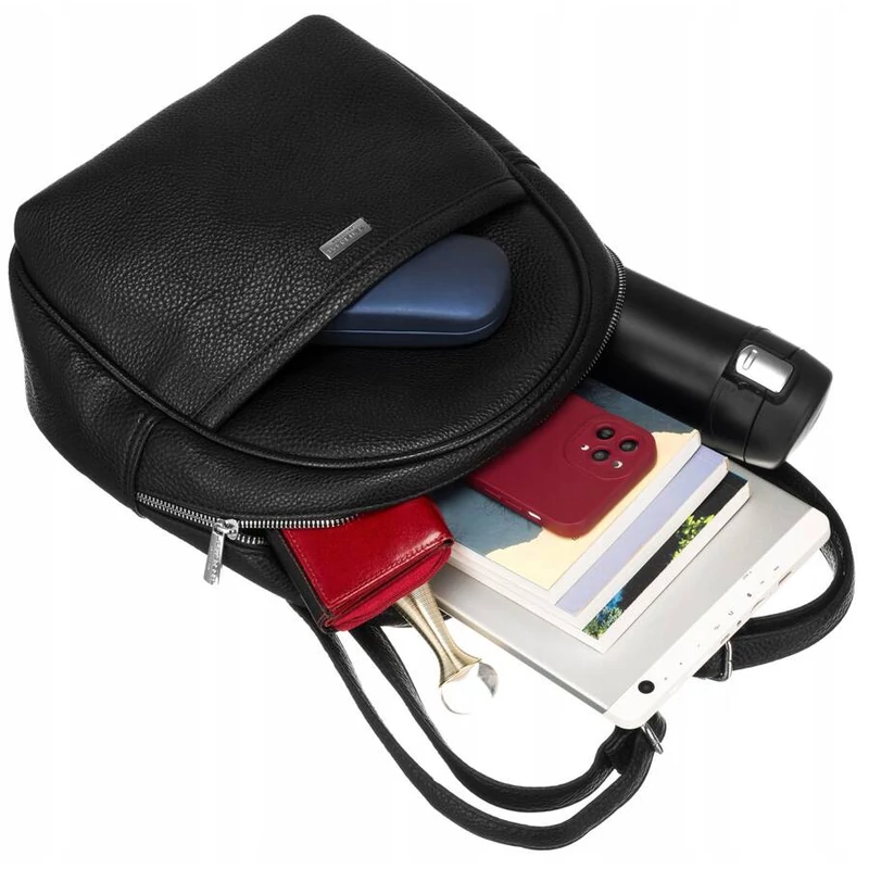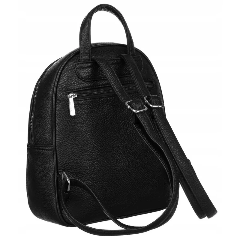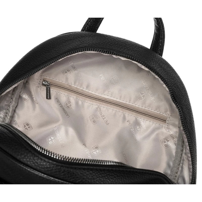van , melynek belseje 2 zsebbel van felszerelve:  az egyik cipzárral zárható, a másik nyitott, és 3 külső,  tömör cipzárral záródó zseb. A hátizsákba könnyedén elfér telefon, pénztárca és még egy tablet is! Az egésznek van egy szövet bélése, amely megóvja az eco-bőrt a sérülésektől a tárgyak be- és kivételekor.