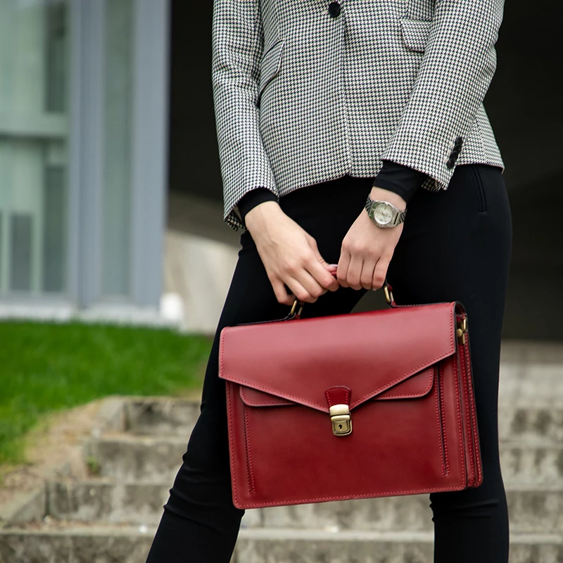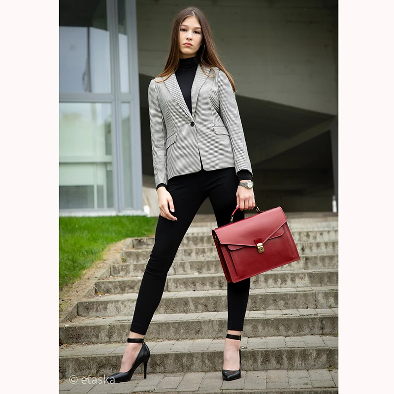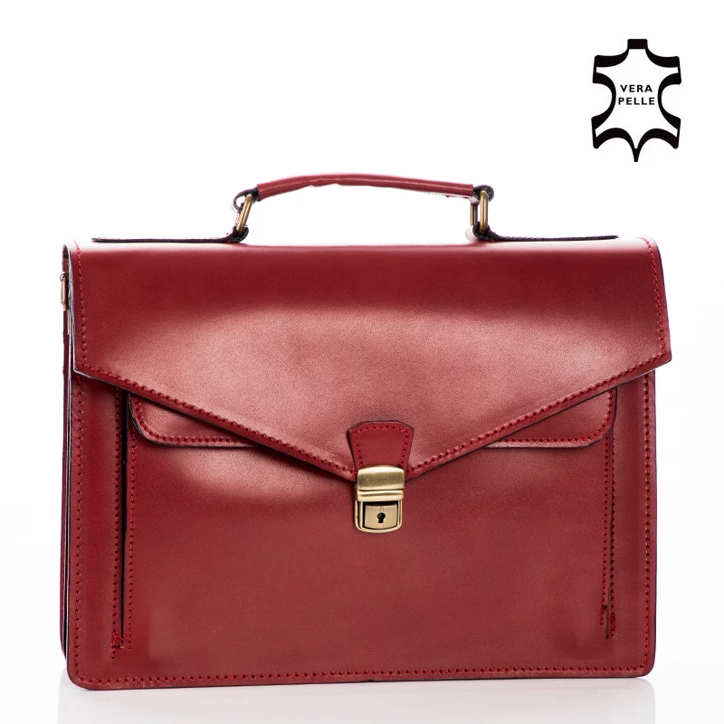Valódi bőr aktatáska piros színben. A ráhajtó alatt 2 fő rekesz található, plusz 1 kisebb, A5-ös méretű tároló, amit két mágnescsat zár le. Az aktatáska külső részén, a hátoldalán egy nagy cipzáras rekesz van. Kulccsal zárható bőr aktatáska. Erős, szegecselt és varrott kézi fogantyú és rácsatolható hosszú pánttal hordható. Olasz bőrdíszműves aktatáska.