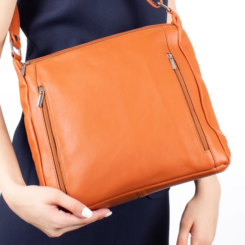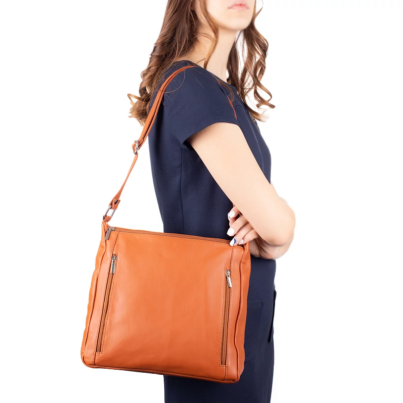 Valódi bőrből készült, puha tapintású női táska. Sok praktikus rekesze van. Három kívül helyezkedik el a táskán. Két külön nyíló fő rekesze van, cipzáras záródásúak, biztonságosak. Egyik fő rekeszében található még egy rejtett cipzáras zseb. Kényelmes viseletű táska, pántját igény szerint variálhatjuk rövidebbre és hosszabbra. Maximum 125 cm-ig. Pántjának szélessége 2,5 cm.
