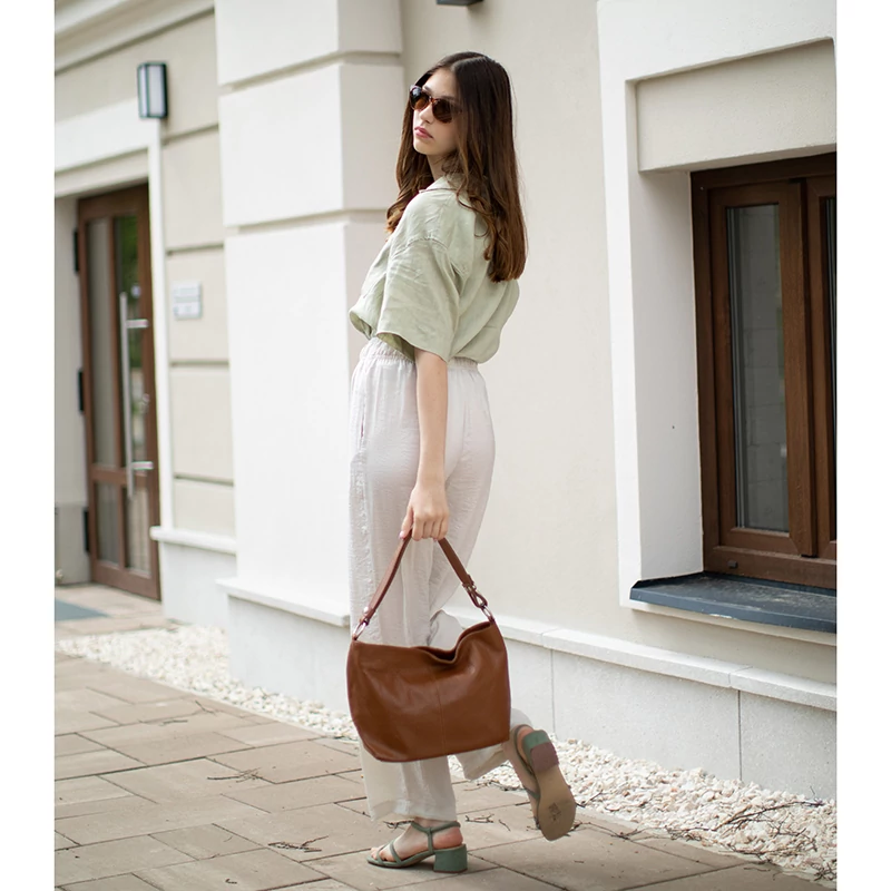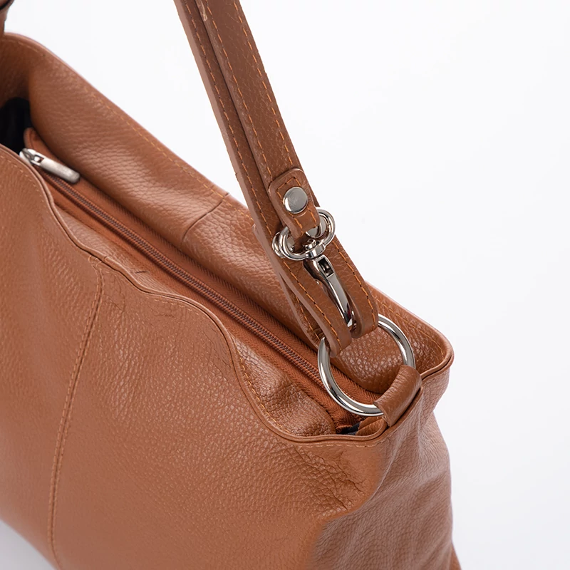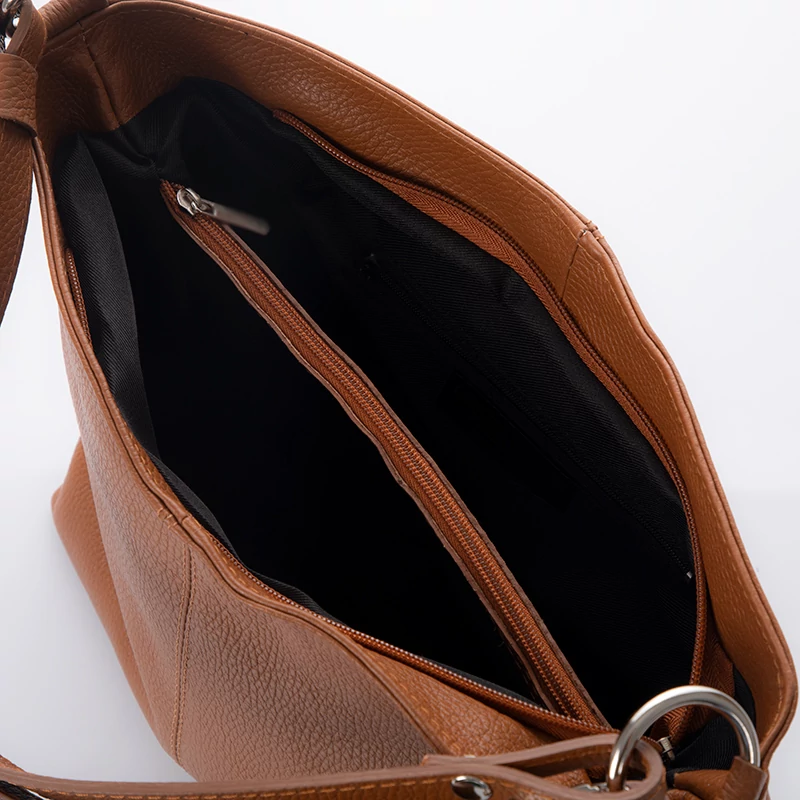 Közepes méretű női táska, amiben kényelmesen elfér a nagyméretű női pénztárca, a normál méretű összecsukható esernyő, a többi mindennapi holmi mellett.