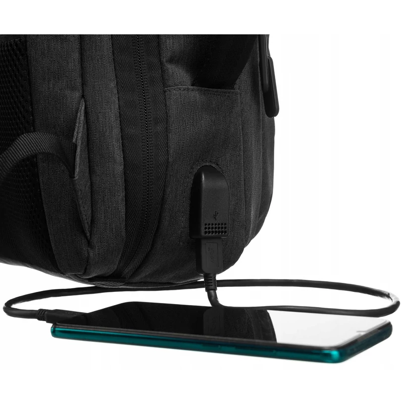 A hátizsák külső USB porttal van felszerelve , melynek köszönhetően töltheti telefonját, táblagépét és egyéb eszközeit. Csak csatlakoztassa a hátizsákban található USB-kábelt a powerbankhoz, és onnantól kezdve áramellátást kap az USB-porton. Az USB kábel hossza 55 cm.