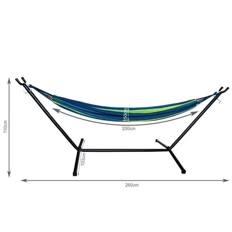 - MŰSZAKI ADATOK - szín: többszínű; anyaga: műanyag, szövet, acél; maximális terhelés: 200 kg; keret méretei (szélesség / magasság): 260/110 cm; függőágy méretei (hosszúság / szélesség): 200/150 cm; súly: 13 kg; súly a csomagban: 13,5 kg.