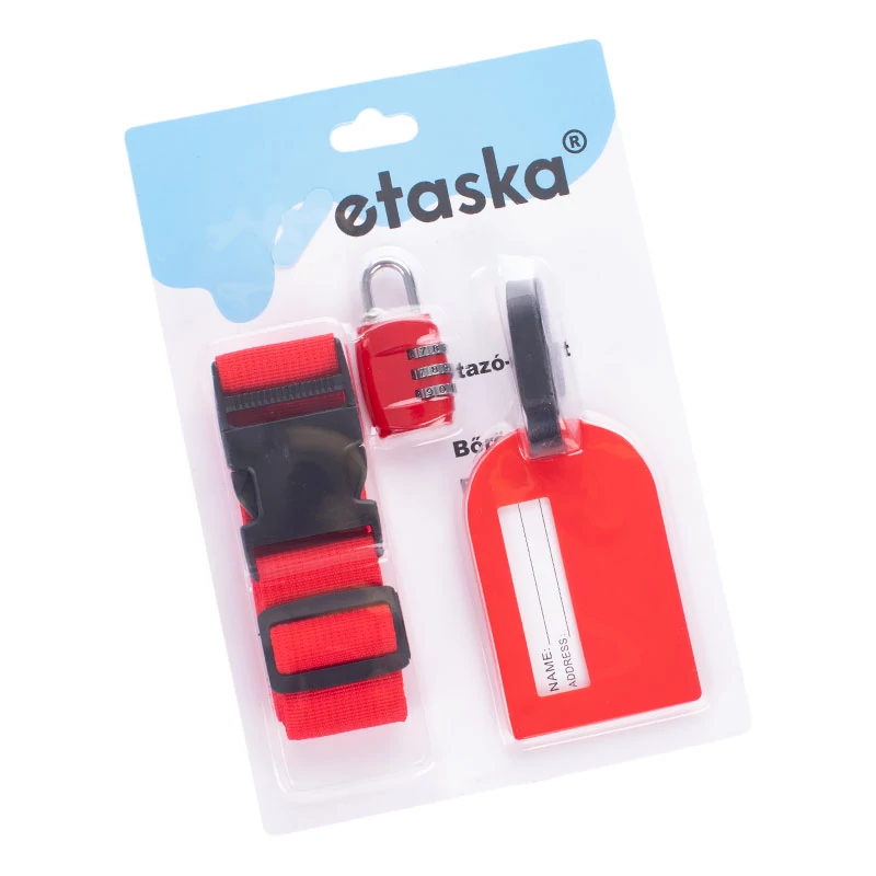 Ez a piros színű utazási kiegészítő csomag minden olyan dolgot tartalmaz, amire szükséged lehet egy biztonságos és kényelmes utazás során. A csomagban található egy bőröndpánt, amely segít megakadályozni a bőrönd elcsúszását a futószalagon. A pántot egy számokkal ellátott lakat zárja le, így megvédve az értékeidet. Az utolsó darab pedig egy bőröndcímke, amely segítségével egyszerűen felismerheted a saját bőröndödet az összes többi közül. Mindezekkel együtt garantáltan nyugodtan indulhatsz el az úti célod felé!