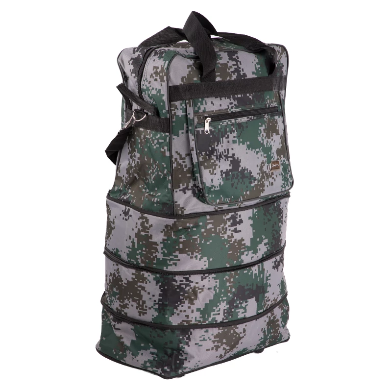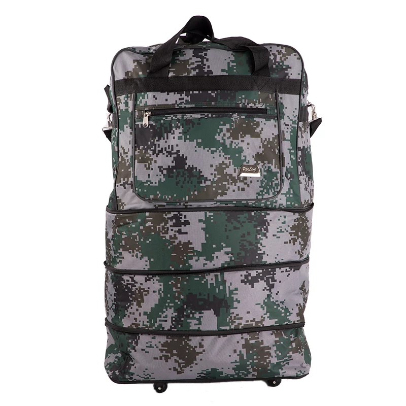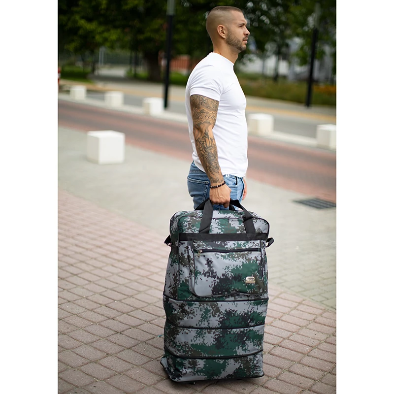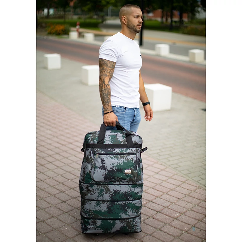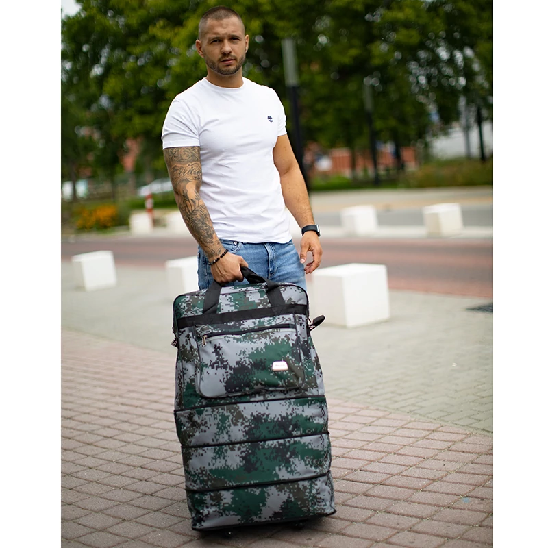 Jó nagy, praktikus, hogy összecsukható. A színe miatt könnyű a reptéren is megtalálni:-)