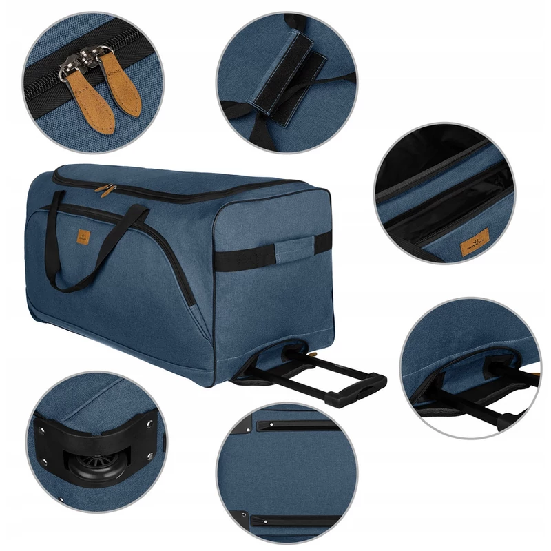 A táska ezenkívül 2 rögzíthető felső fogantyúval és 1 oldalsó fogantyúval van felszerelve . Köszönhetően nekik, könnyen áthelyezheti olyan helyekre, ahol a kerekek használata lehetetlen, vagy kényelmesen bepakolhatja autója csomagtartójába. A kihúzható fogantyú maximális magassága: 30 cm.