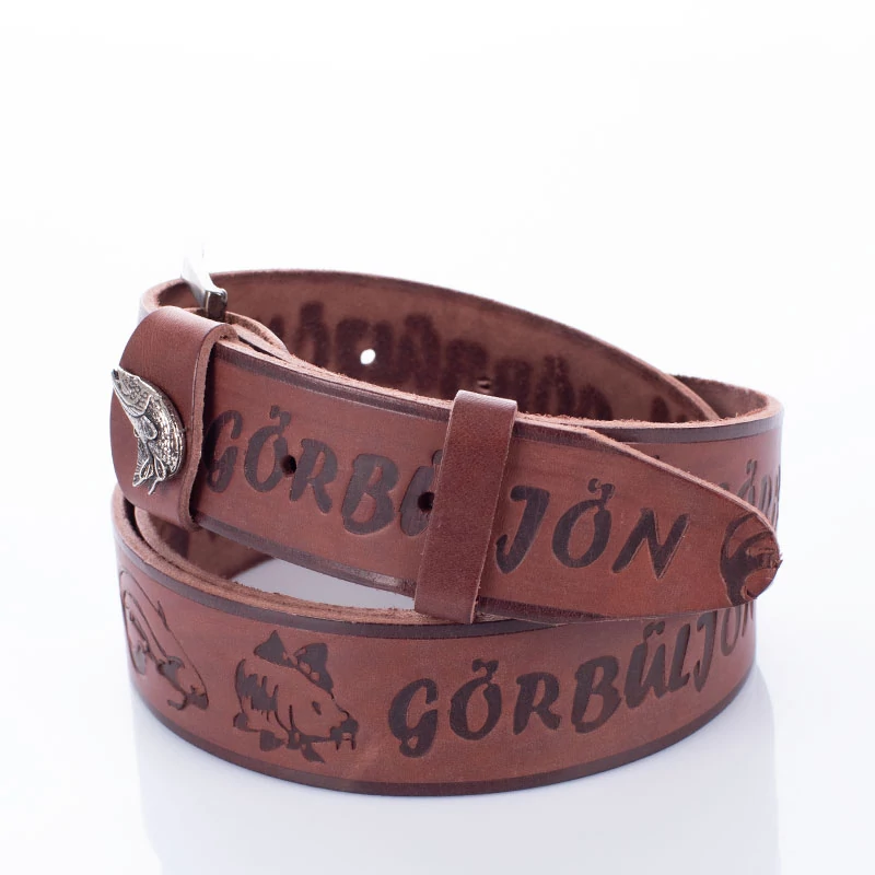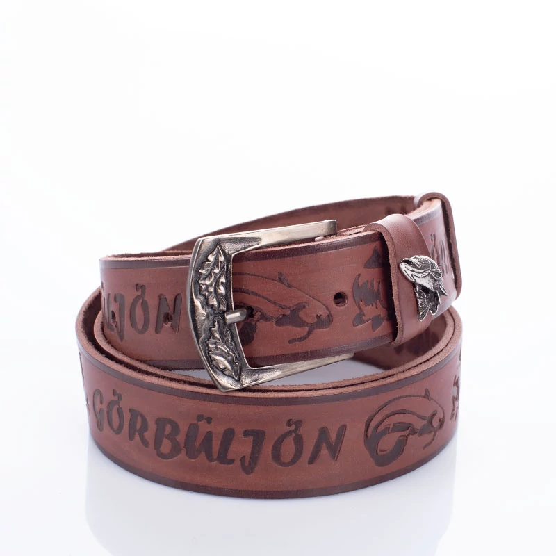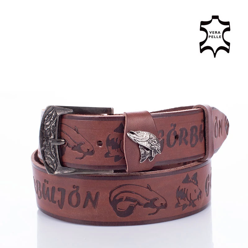 Süllő mintával ellátott horgász barna színű férfi öv. Kiváló választás lehet mindenki számára aki szeret horgászni, és kedveli a minőségi darabokat. Hiszen ez a férfi nadrágszíj magas minőségű, masszív marhabőrből, egyedi mintával készült, magyar kézműves termék. Anyagának köszönhetően ez a férfi bőr öv strapabíró, és erős tartást biztosít az egész nap folyamán. Nem utolsó sorban pedig, farmernadrággal is kényelmesen hordható. Az öv 7 méretben kapható, és méretre szabható, szélessége pedig 4 cm. Ajándékba is remek választás lehet horgász ismerősünknek, így díszdobozzal együtt is elérhető ez a nadrág öv.