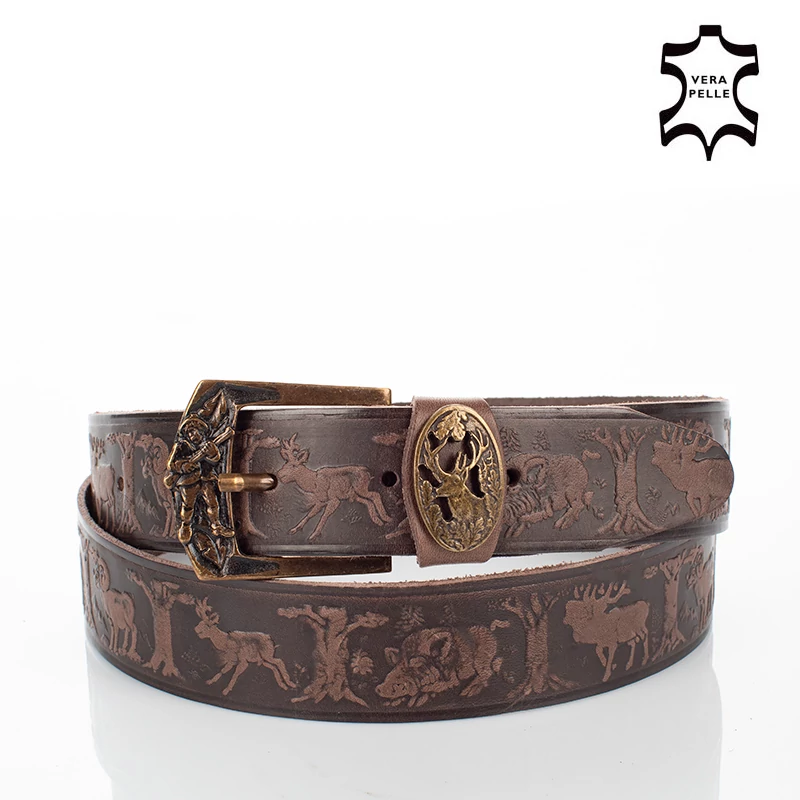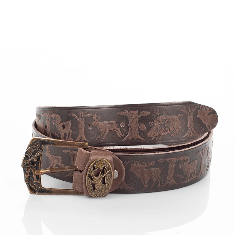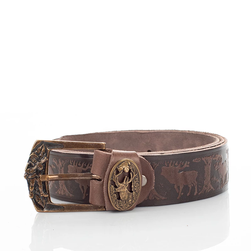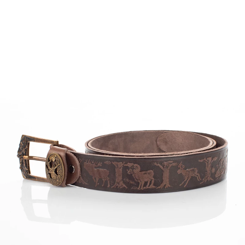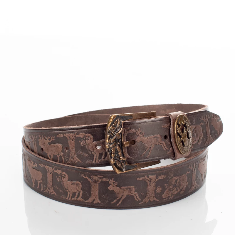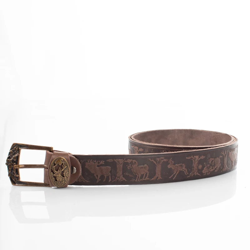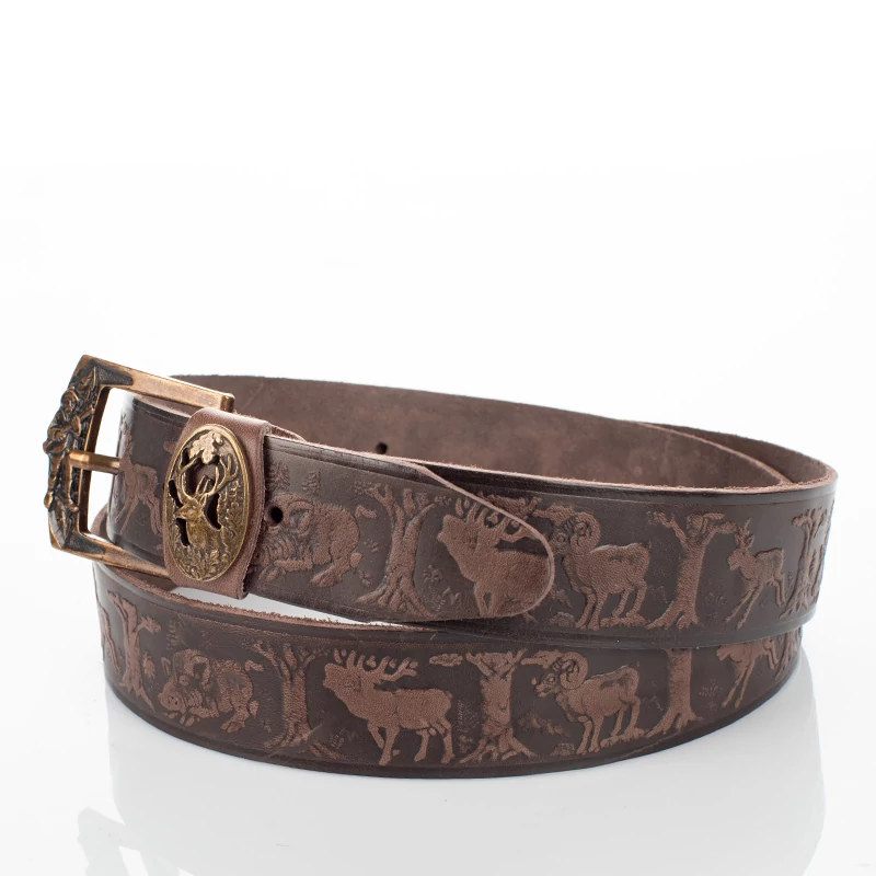 Szarvas mintával ellátott barna színű vadász férfi öv. Kiváló választás lehet mindenki számára aki szeret vadászni, és kedveli a minőségi darabokat. Hiszen ez a férfi nadrágszíj magas minőségű, masszív marhabőrből, egyedi mintával készült, magyar kézműves termék. Anyagának köszönhetően ez a férfi bőr öv strapabíró, és erős tartást biztosít az egész nap folyamán. Nem utolsó sorban pedig, farmernadrággal is kényelmesen hordható. Az öv 7 méretben kapható és méretre szabható, szélessége pedig 4 cm. Ajándékba is remek választás lehet vadász ismerősünknek, így díszdobozzal együtt is elérhető ez a nadrág öv.
