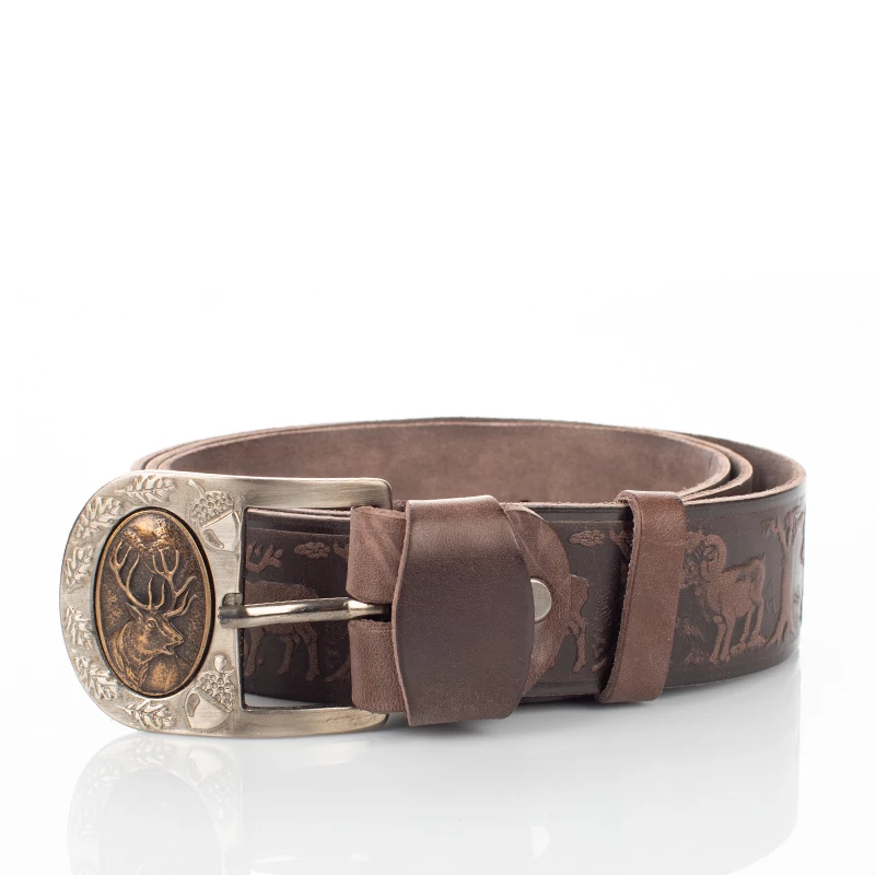 Vadász öv szarvasfej mintával barna színben 135 cm-től 90 cm-ig