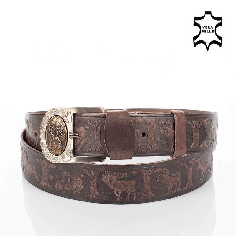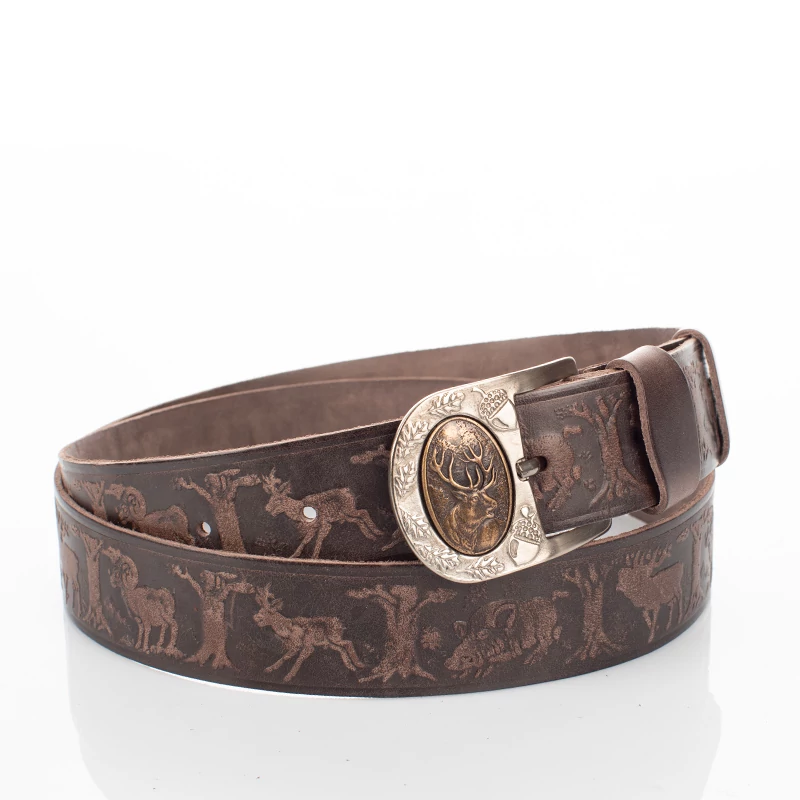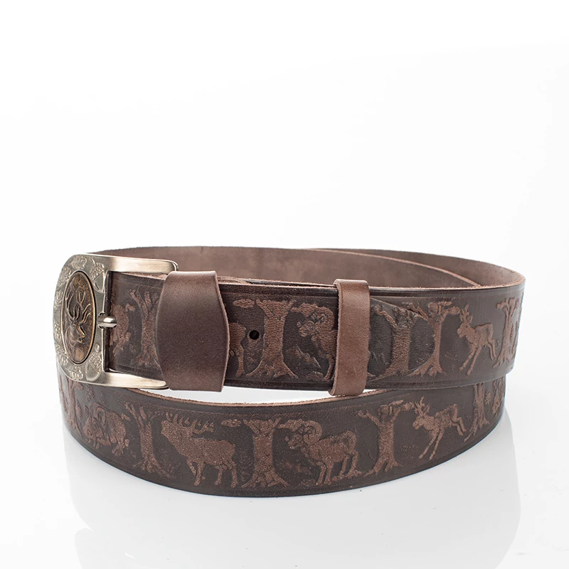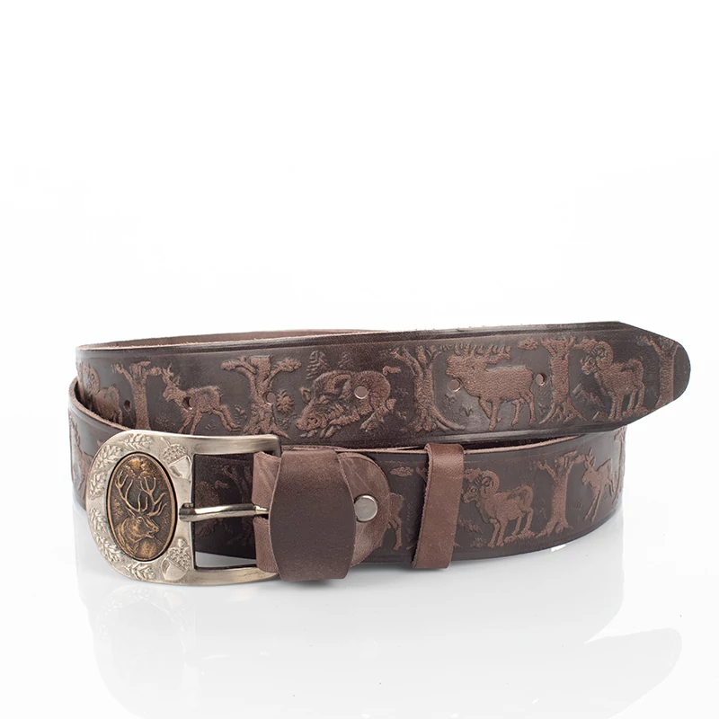 Vadász mintával ellátott barna színű vadász férfi öv. Kiváló választás lehet mindenki számára aki szeret vadászni, és kedveli a minőségi darabokat. Hiszen ez a férfi nadrágszíj magas minőségű, masszív marhabőrből, egyedi mintával készült, magyar kézműves termék. Anyagának köszönhetően ez a férfi bőr öv strapabíró, és erős tartást biztosít az egész nap folyamán. Nem utolsó sorban pedig, farmernadrággal is kényelmesen hordható. Az öv 7 méretben kapható és méretre szabható, szélessége pedig 4 cm. Ajándékba is remek választás lehet vadász ismerősünknek, így díszdobozzal együtt is elérhető ez a nadrág öv.