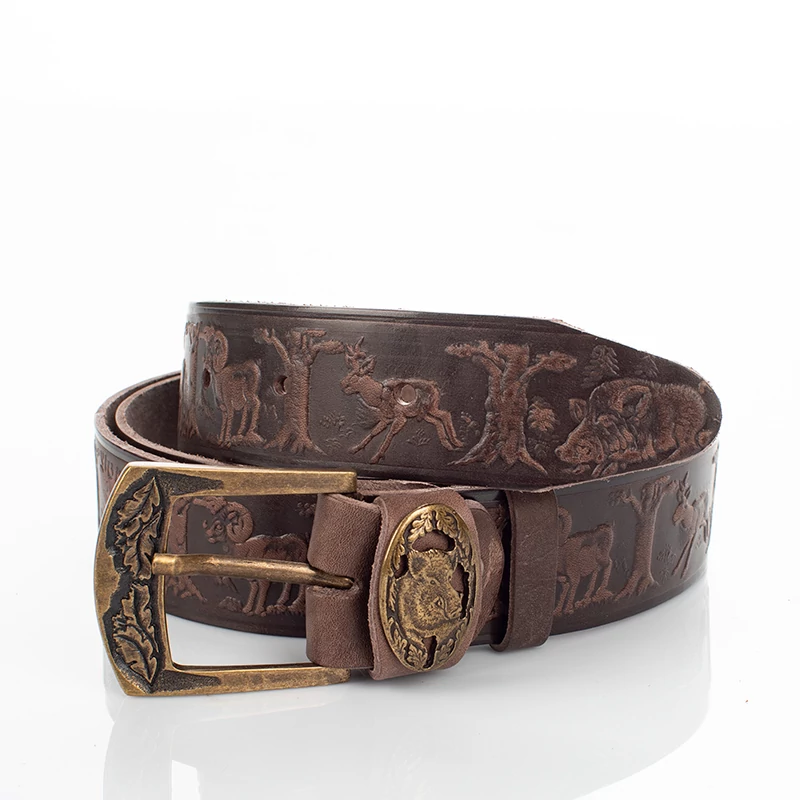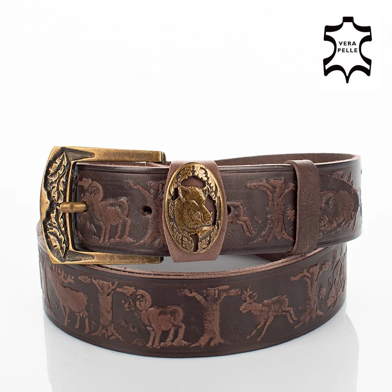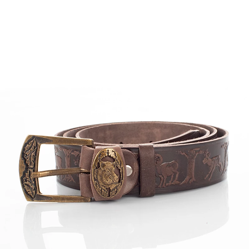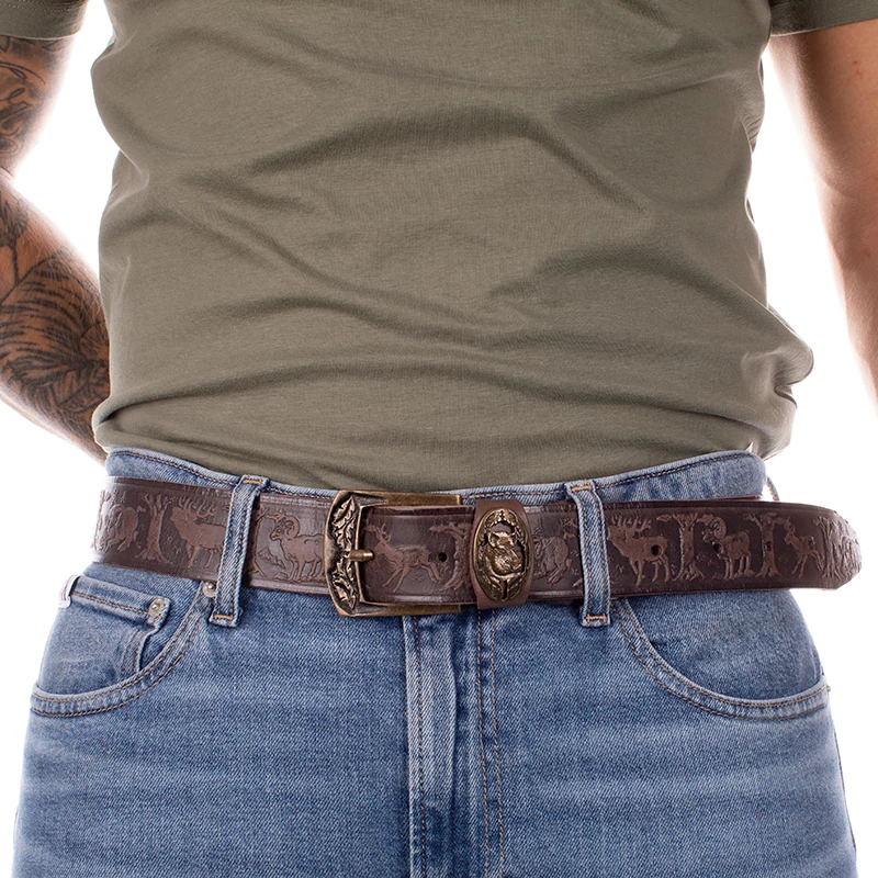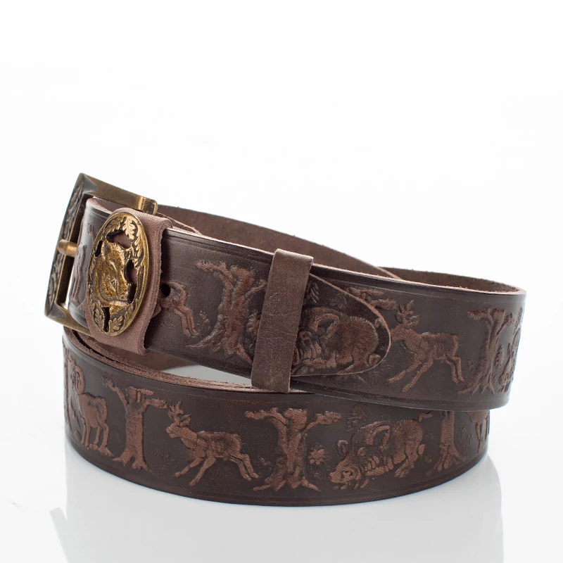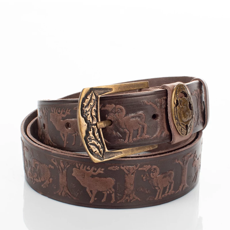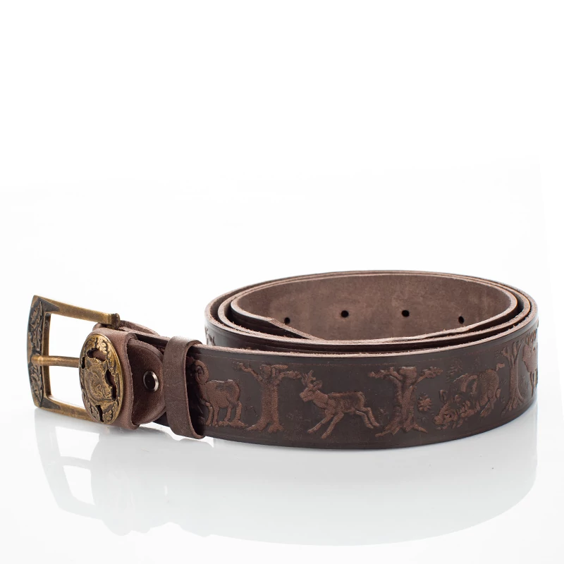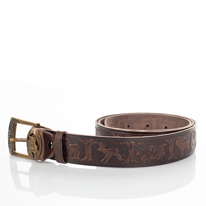 Vadász mintával ellátott barna színű vadász férfi öv. Kiváló választás lehet mindenki számára aki szeret vadászni, és kedveli a minőségi darabokat. Hiszen ez a férfi nadrágszíj magas minőségű, masszív marhabőrből, egyedi mintával készült, magyar kézműves termék. Anyagának köszönhetően ez a férfi bőr öv strapabíró, és erős tartást biztosít az egész nap folyamán. Nem utolsó sorban pedig, farmernadrággal is kényelmesen hordható. Az öv 7 méretben kapható és méretre szabható, szélessége pedig 4 cm. Ajándékba is remek választás lehet vadász ismerősünknek, így díszdobozzal együtt is elérhető ez a nadrág öv.