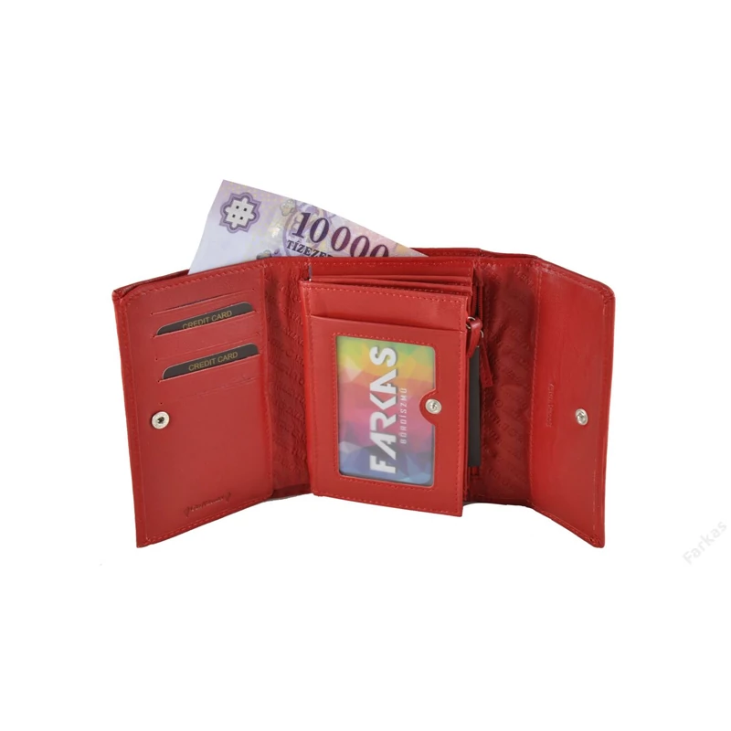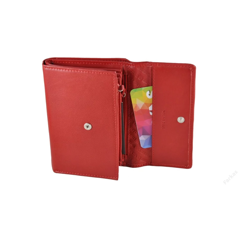 Elegáns női pénztárca kiváló minőségű, puha tapintású olasz bőrből. Fedele patenttal nyitható. Belsejében több papírpénztartó, cipzárral nyitható aprópénztartó és több kártyatartó illetve igazolványtartó található. Fekete díszdobozban szállítjuk.