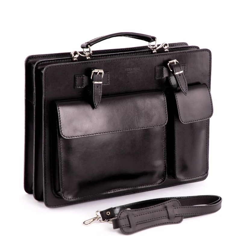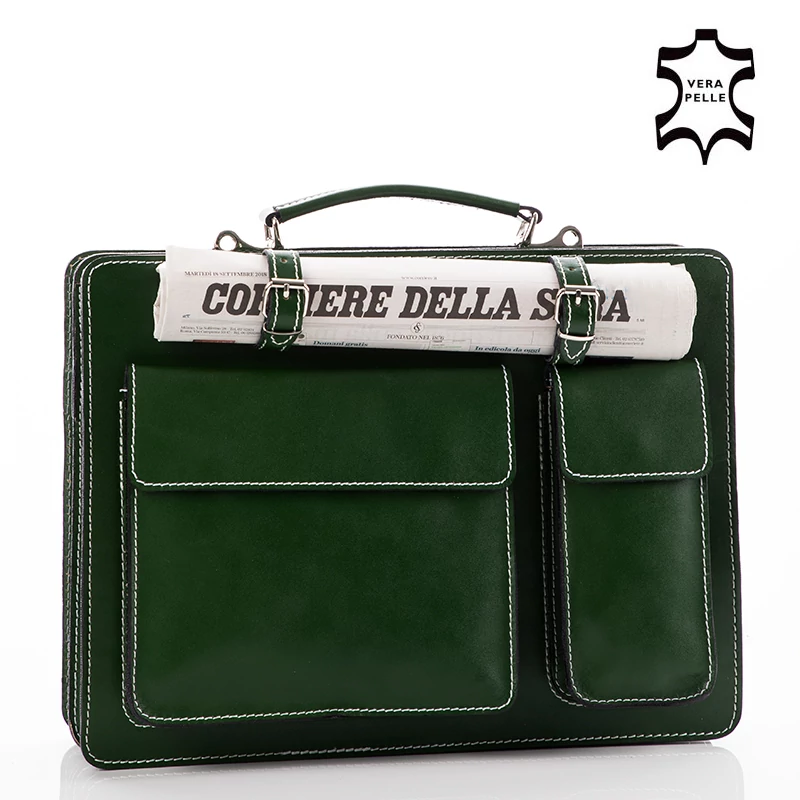 Zöld színű aktatáska, merev tartású 2 részes valódi bőrből készült. Kézi fogóval illetve vállpánttal rendelkezik, a kényelmesebb viselet érdekében. Kézi fogója ezüst színű fém fogótartókkal kapcsolódik a táskához. Vállpántja színben megegyezik a táskával, mely szintén varrott. A táska elején egy nagyobb és egy kisebb patentos zseb került kialakításra.A táska pakolóterei egymástól elkülönítve nyílnak cipzárral. A belső nagy zsebei tablet vagy iratok illetve személyes tárgyak tárolására alkalmasak.A táska hátsó részén egy cipzáras zseb található.A táska elején található kettő darab csatos szíj, mely tökéletesen alkalmas esernyő tárolására. Üzleti, valamint sportosan elegáns öltözethez is egyaránt kombinálható.