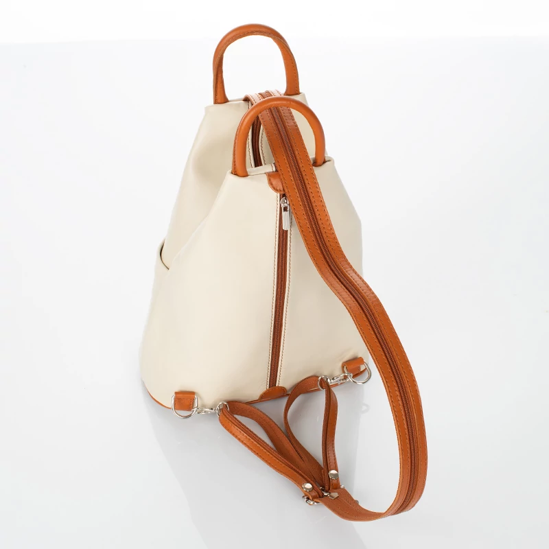Valódi bőr női hátizsák. Kívül 2 cipzáras és 1 nyitott zsebe van.