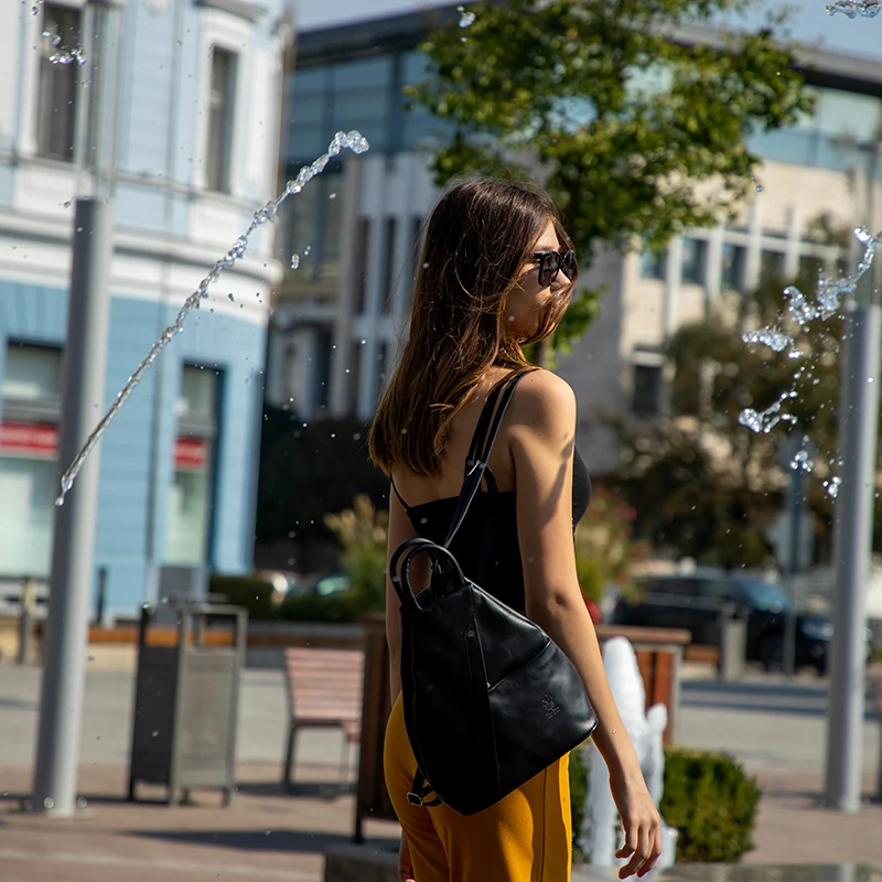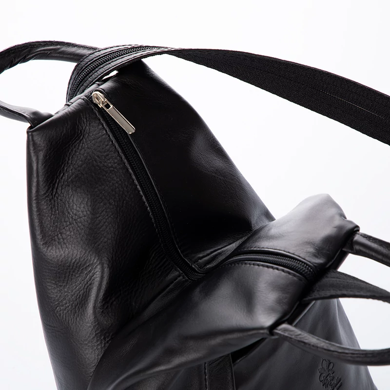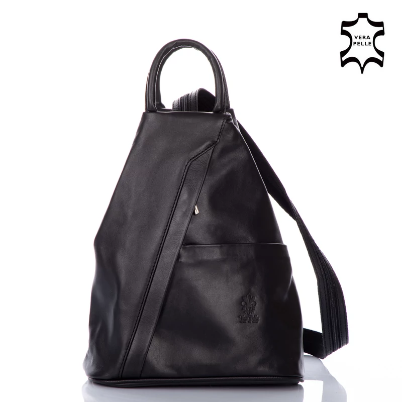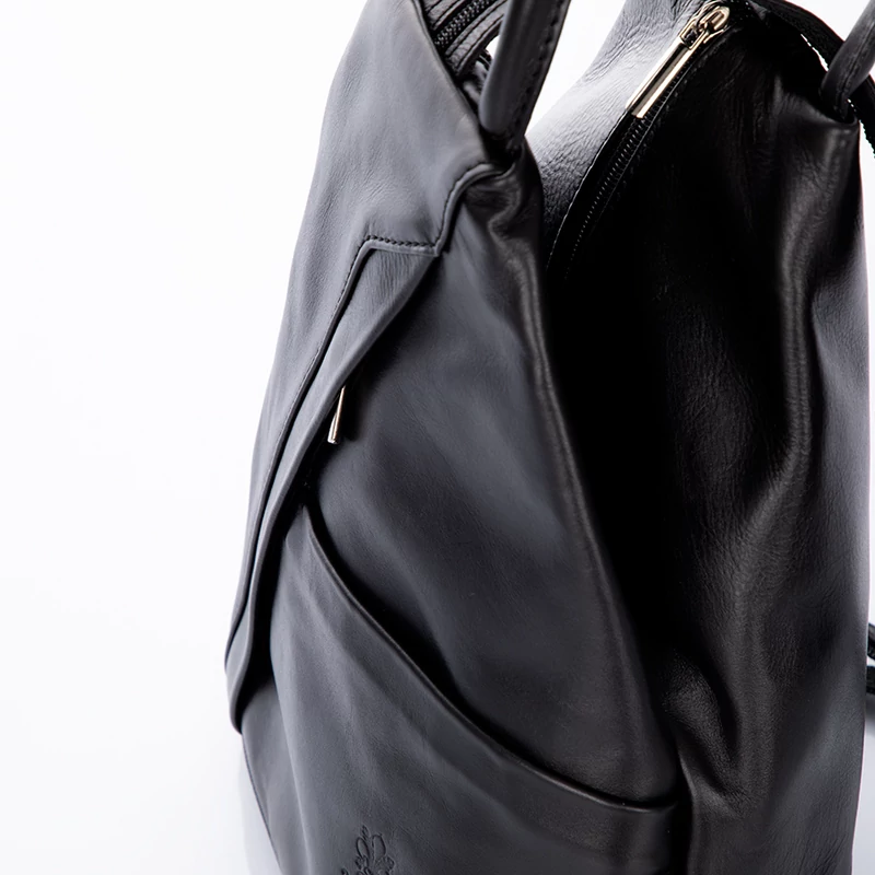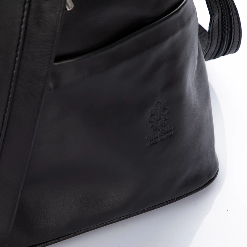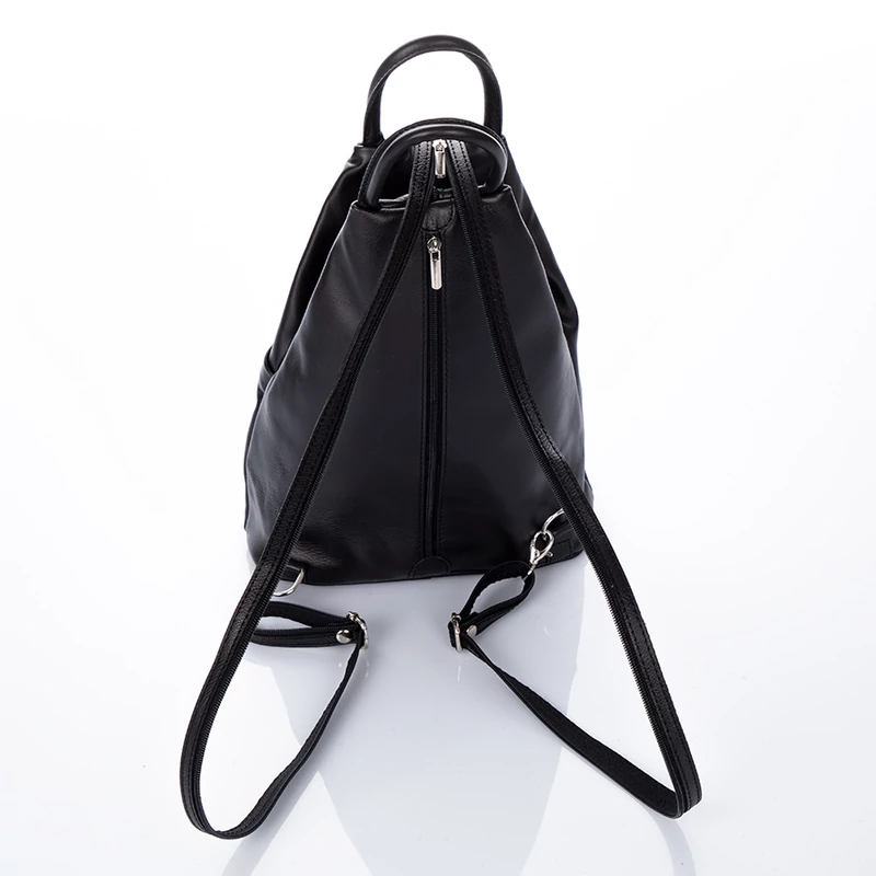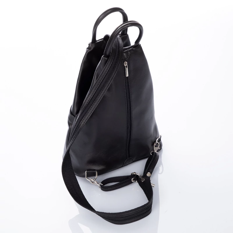 Valódi bőr női hátizsák. Kívül 2 cipzáras és 1 nyitott zsebe van. Belseje egyterű, 1 mobiltartó és 1 oldalsó rejtett cipzáras tárolóval ellátva. A teteje cipzáras, biztonságos. Kis kézi fogantyúja is van. Vállpántja össze is cipzárazható, ha félvállon szeretnénk hordani. Hosszúsága állítható. Olaszországban készült bőrdíszműves táska. A személyes apróságok mellett elfér benne a nagyméretű pénztárca, a normál méretű összecsukható esernyő is, illetve egy fél literes palack is.