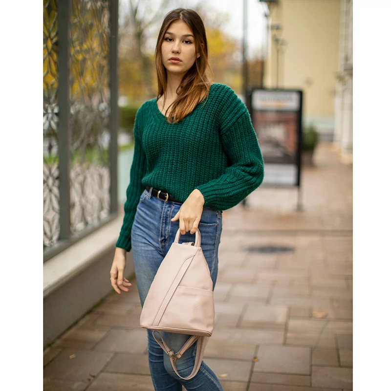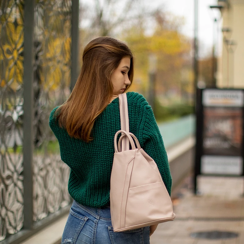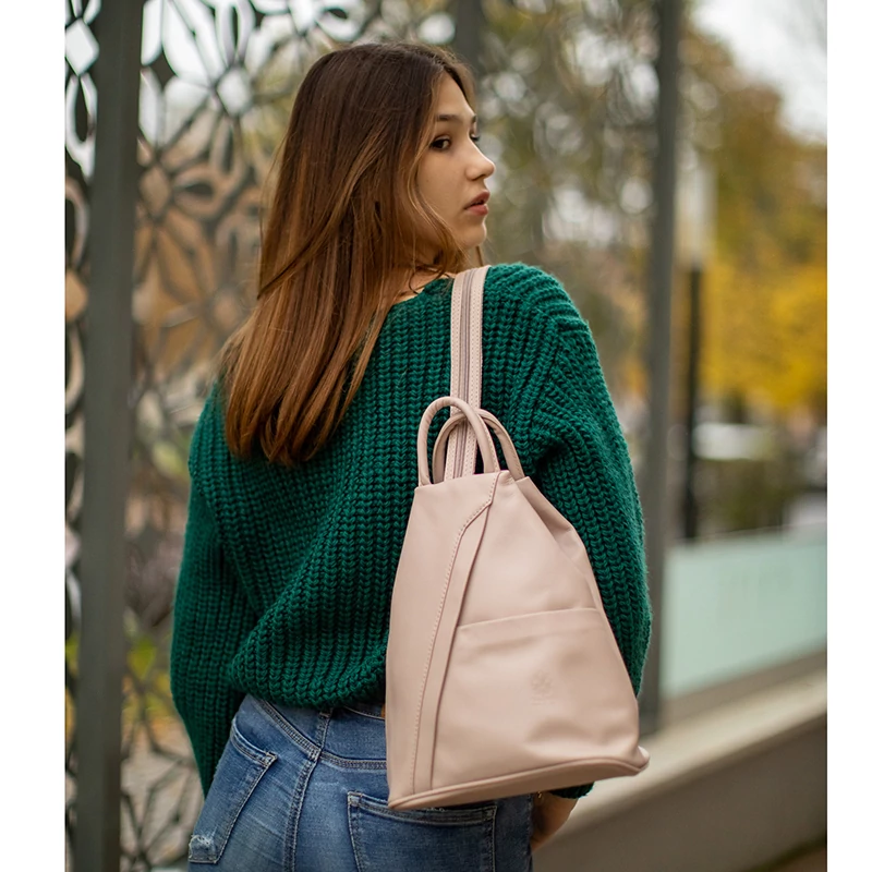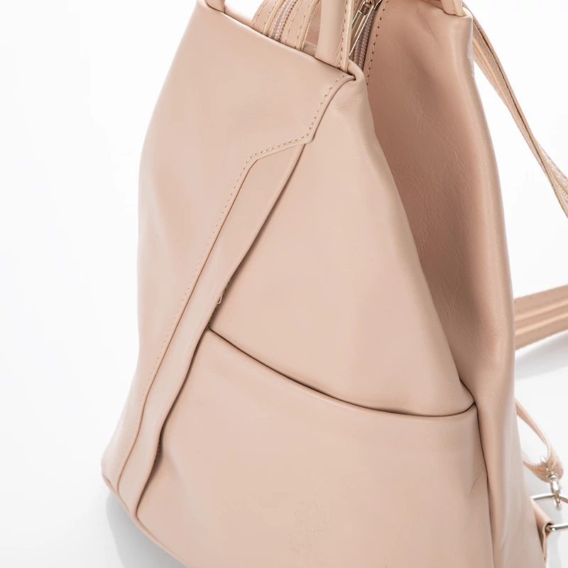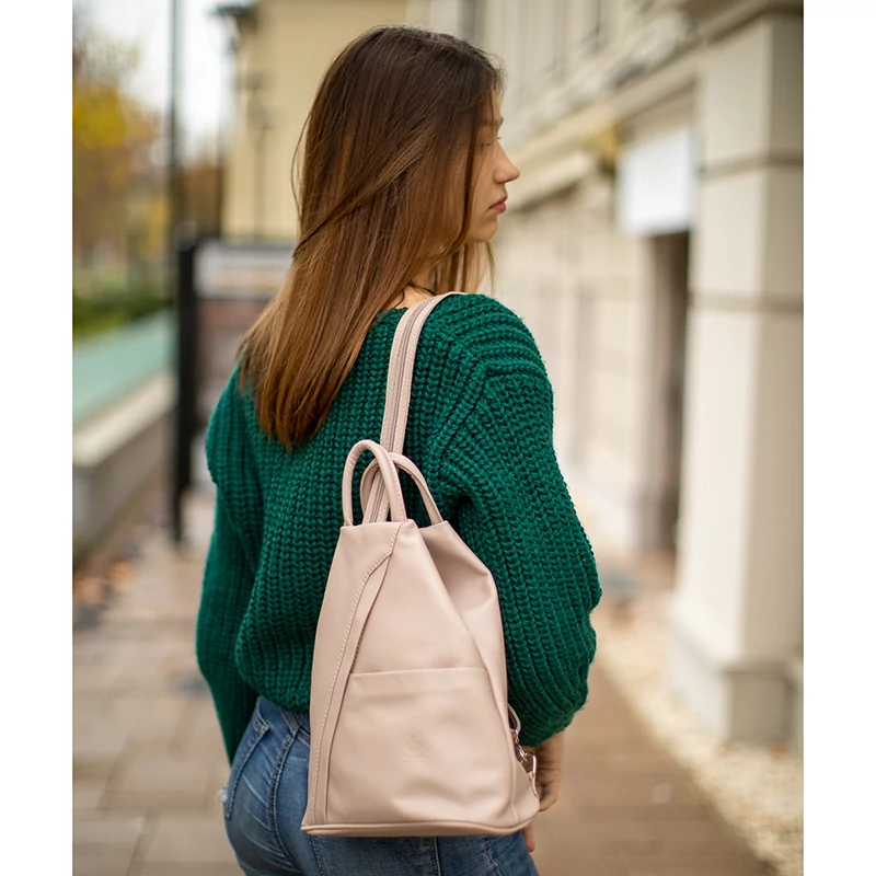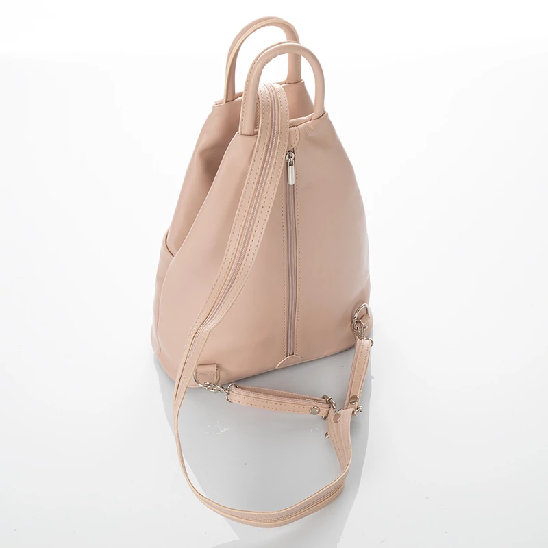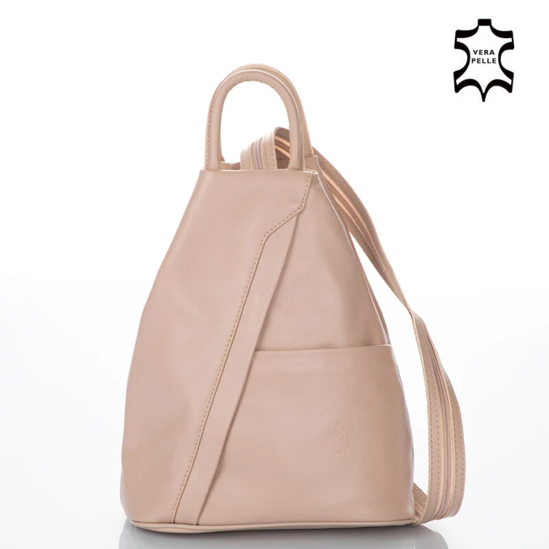Valódi bőrből készült, pihe-puha tapintású női hátizsák. A belsejében egy cipzáras zseb található, ennek mérete alkalmas telefon tárolására is. A táska elején, kívül is van egy cipzáras zseb, plusz még egy nyitott fiók is. A táska hátoldalán is helyet kapott egy cipzáras rekesz. Praktikus, jól elszeparálhatóak benne az ilyen-olyan holmijaink. A táska fő rekeszében kényelmesen elfér egy 0,5 literes palack is, vagy egy ekkora méretű esernyő is. Kényelmes viselet mindenki számára, akár kirándulni, akár kerékpárral közlekedni, akár munkába járni, vagy bárhová. Tizenötféle színben kapható, mindenki megtalálja a számára legideálisabbat.