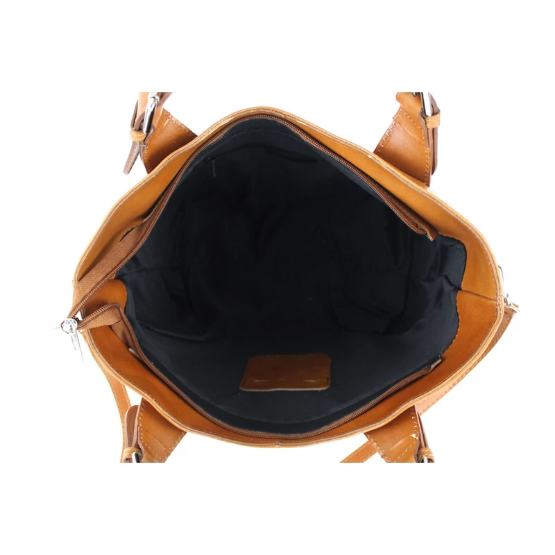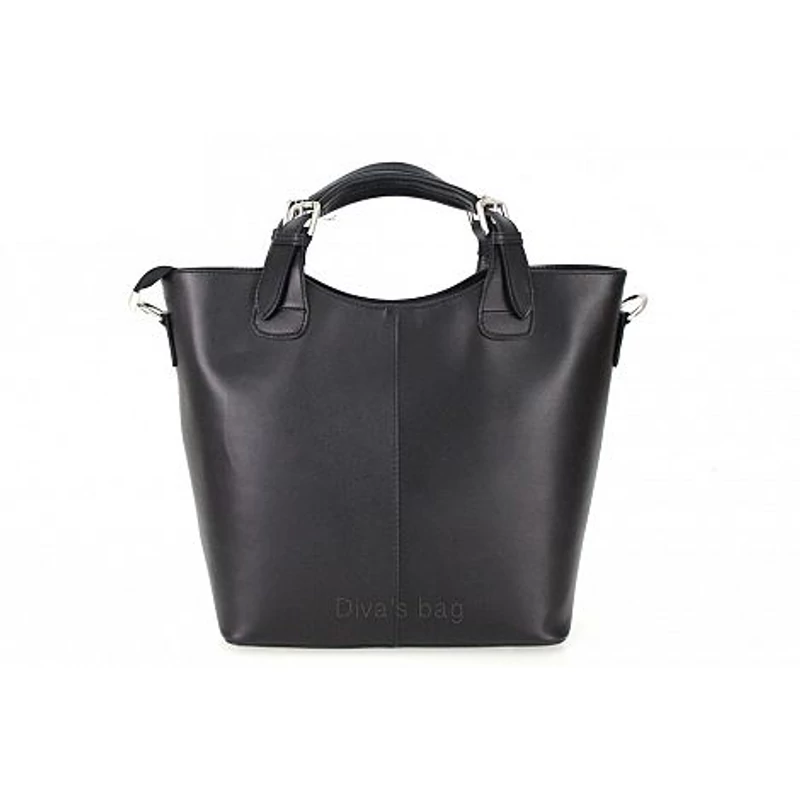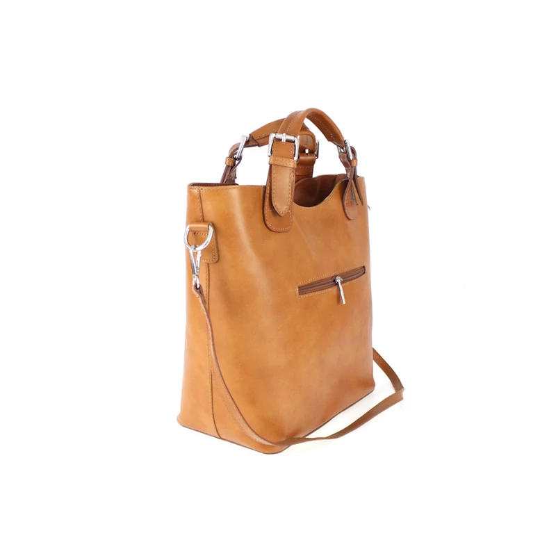 Valódi bőrből készült, merev tartású női táska. Nagy méretű, igazán jól pakolható. Belseje egyterű, oldalsó zsebekkel ellátva: egy nyitott és egy cipzáras rejtett zseb. Külsején is található egy cipzáras rekesz, pl mobilunknak, vagy kulcsainknak. Kis fülével kézben hordhatjuk, hossza 40 cm. Rácsatolható hosszú pánttal küldjük a táskát, melynek hossza 110 cm. A táska teteje biztonságosan cipzárral záródik. Alján négy fémtappancs van, ezek megvédik a kopástól, piszkolódástól. Minden korosztály számára megfelelő fazonú. Klasszikus, mégis vagány és divatos női táska, mely Olaszországban készült.