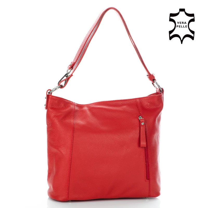 Piros színű, puha tapintású, valódi bőr női táska. Különleges állítható vállpánttal rendelkezik, így kétféle hosszúsággal hordható. A vállpánt maximális hossza 100 cm. A táska elején illetve hátulján egy-egy kisebb zseb lett kialakítva ami alkalmas bérlet, kompakt tükör vagy kisebb személyes tárgyak tárolására. A táska pakoló tere zipzárral nyitható és zárható. A termék belső elosztása praktikus. Két nagy része van amit egy zipzáros rész választ el egymástól, ezen felül egy rejtett zseb valamint egy valódi bőrből készült mobiltartó is kialakításra került. A táska alján négy ezüst színű talp található. Nagy színválasztékkal rendelkezik ez a termékcsalád. A megszokott színek mellett mint pl.: fekete, barna stb.. az igazán vidám színek is megtalálhatóak a termékcsalád palettájában. Mérete.: 37,5 cm x 28 cm x 12 cm