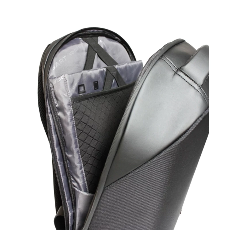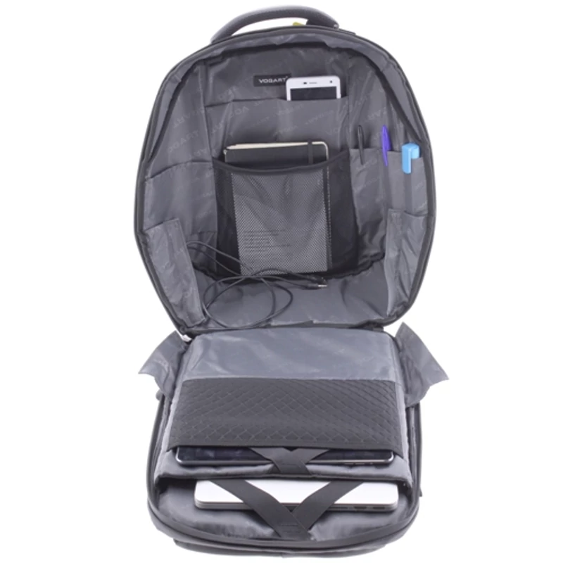 A Vogart lopásbiztos laptophátizsák vízlepergető anyagból készült. Kézben és szivacsos, állítható vállpántjainak, valamint szintén szivacsos hátrészének köszönhetően háton kényelmesen hordható, a bőröndkulira ráhúzható. A laptophátizsák 1 főrekesszel bír, melyben szivacsos iPad-, illetve (15,4"-os) laptoptartót találunk. Beépített USB porttal és Jack dugóval rendelkezik, így kényelmesen töltheti a telefonját, vagy hallgathat zenét (belülről csatlakoztasson egy külső akkumulátort az USB porthoz/zenelejátszót a Jack dugóhoz, kívülről pedig a telefont/fülhallgatót). Ezeken felül több kisebb rekesz is található a hátizsákban, pénztárca, telefon, kulcsok és egyéb holmik számára. Lopás elleni védelem a rejtett cipzáraknak köszönhetően, melyek segítenek megvédeni a táskában lévő értékeit. Titka, hogy nem látható, hogy hol nyílik a táska, hiszen a cipzárak a hát felőli oldalon találhatóak. Anyagát nehezebb átvágni,mint egy hétköznapi táskának. Vastag fala van a megfelelő védelem érdekében, súlya mégis könnyű, nem nehezíti el a hátat, kényelmesen viselhető.